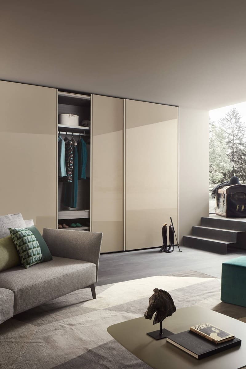 Definito da un sottile profilo verticale metallico tono su tono, l’Armadio al Centimetro Emery di Officinadesign Lema si distingue per le sue raffinate ante in vetro retroverniciato acidato. Grazie a questo trattamento, la superficie risulta opaca, liscia e morbida al tatto, mentre il profilo ricavato nello spessore dell’anta, lungo tutta l’altezza, diventa un elegante dettaglio di stile e funzionale come maniglia.