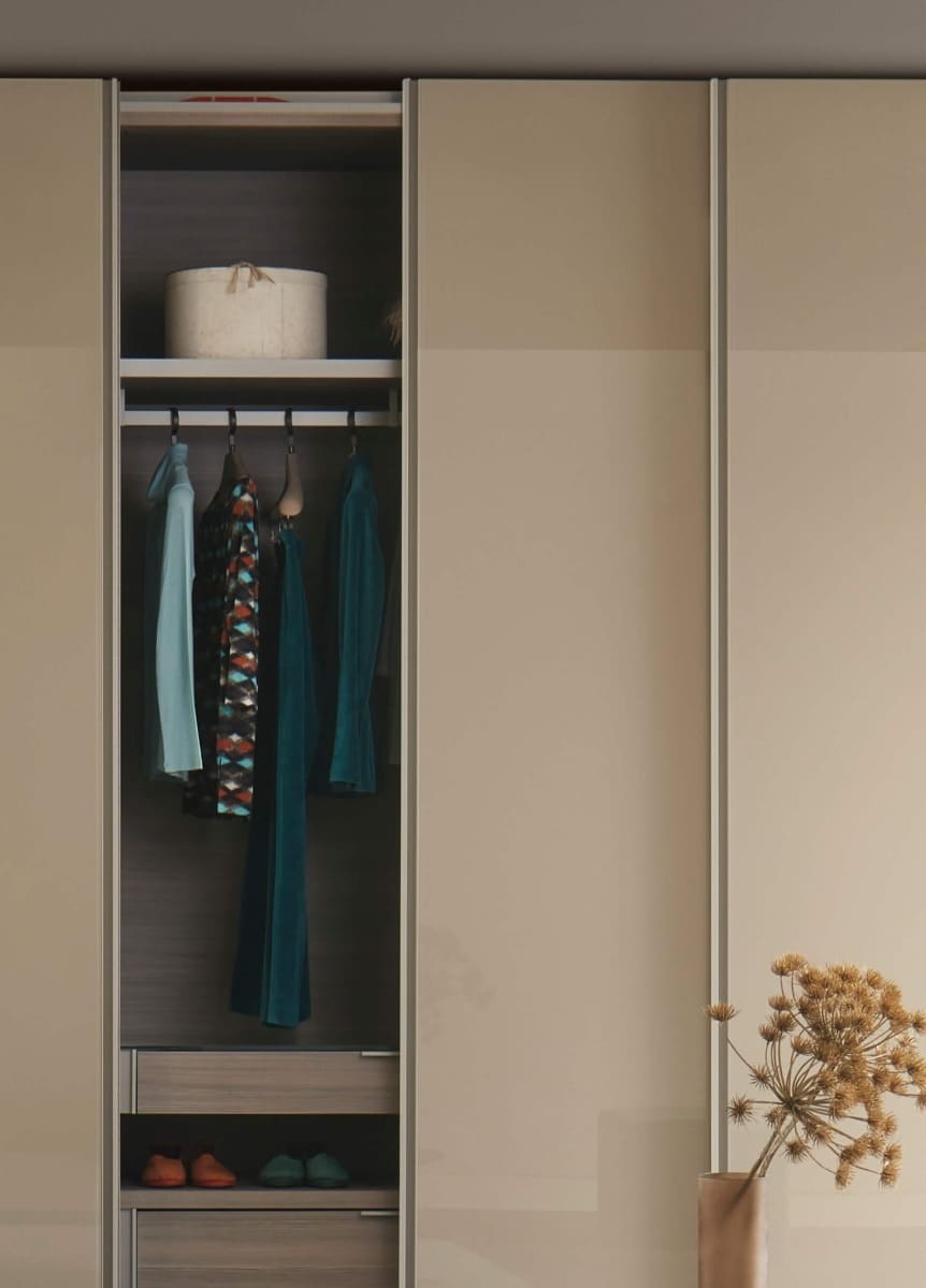 Disponibile con ante a battente o scorrevoli, Emery è riducibile in larghezza e altezza, adattandosi a qualsiasi esigenza spaziale.