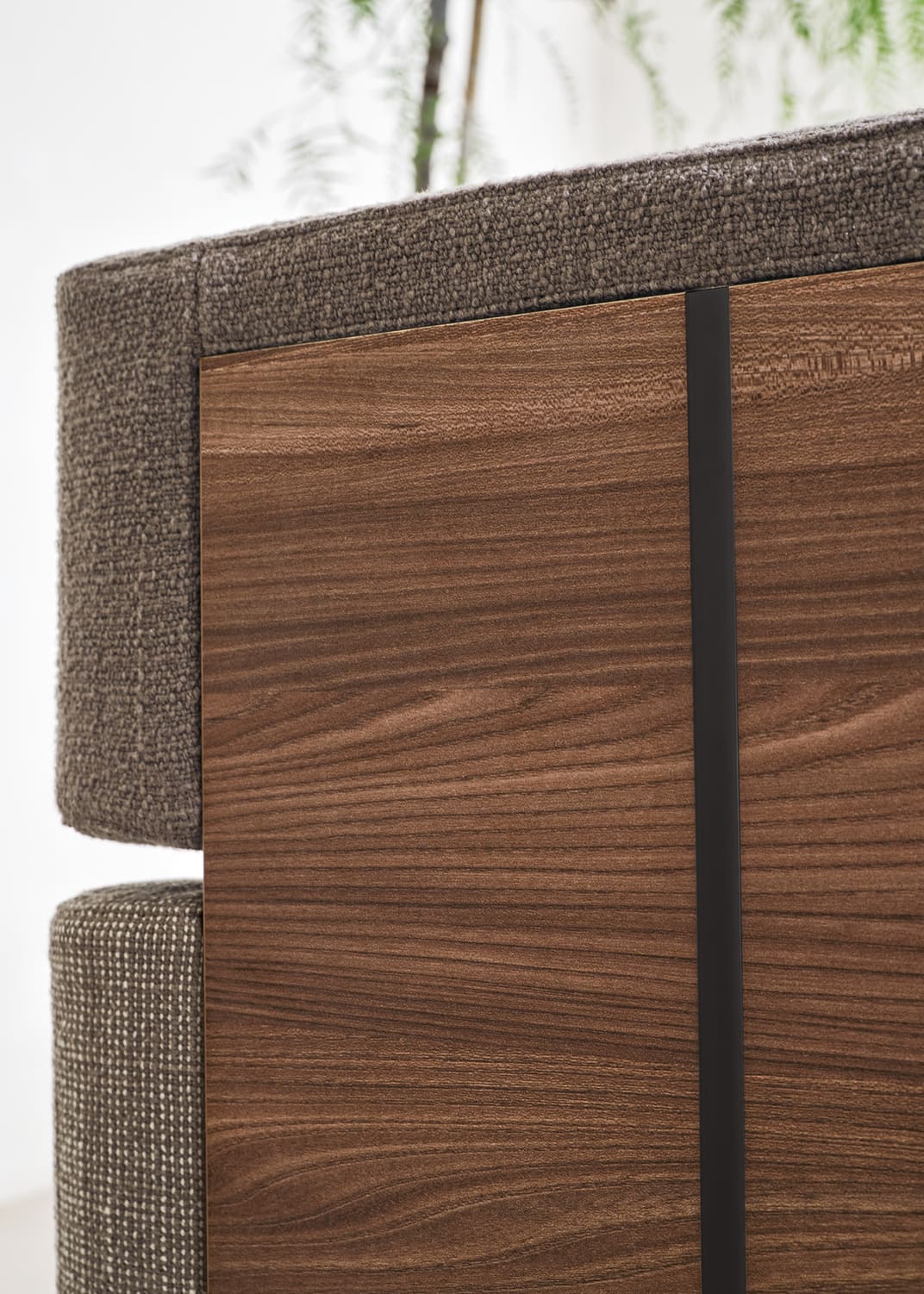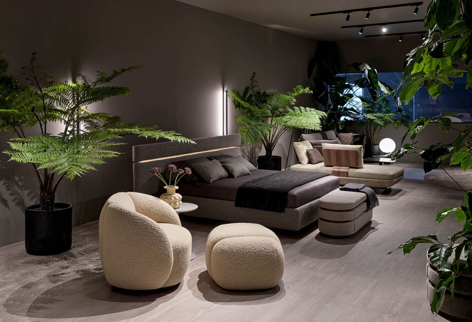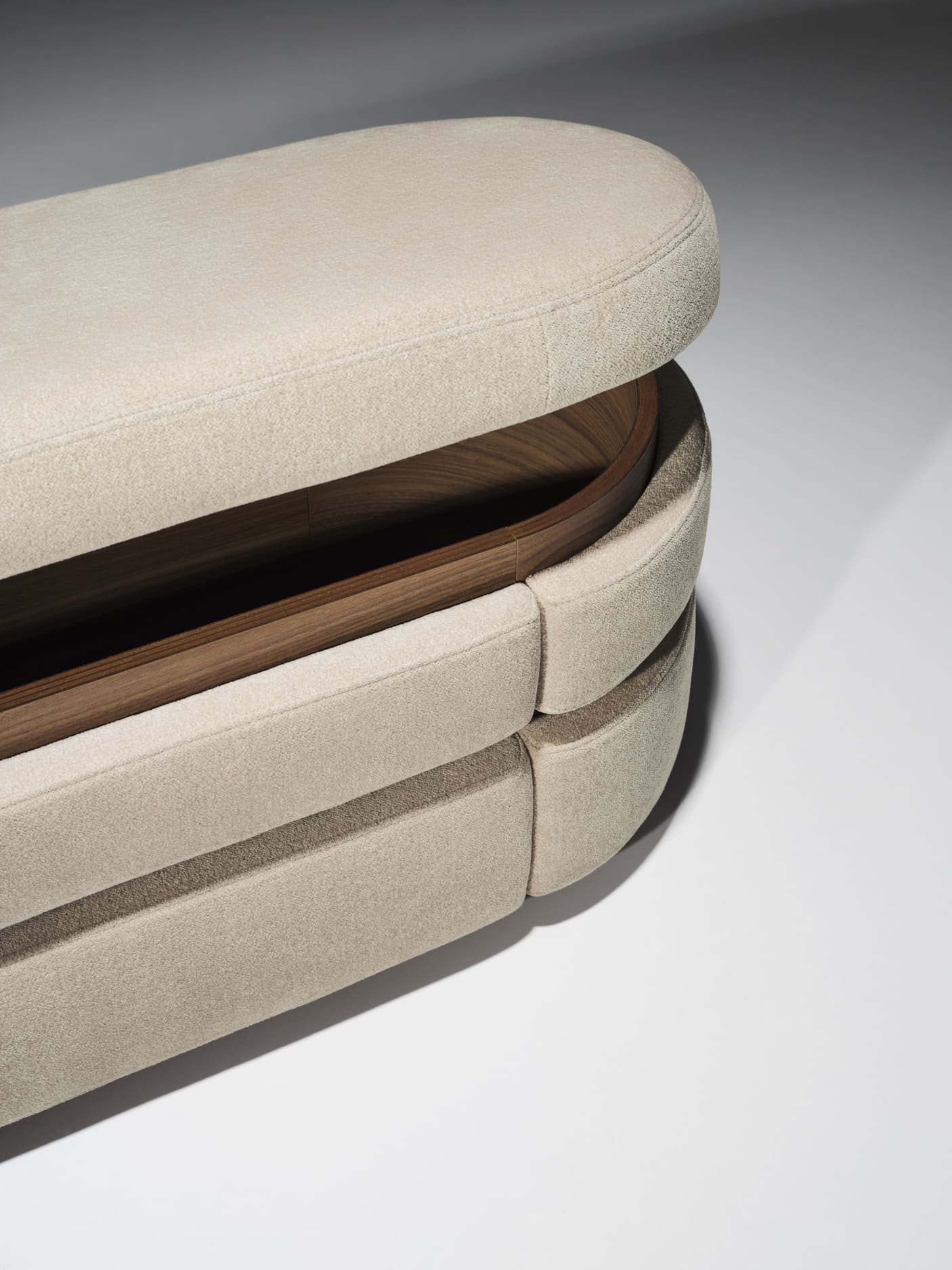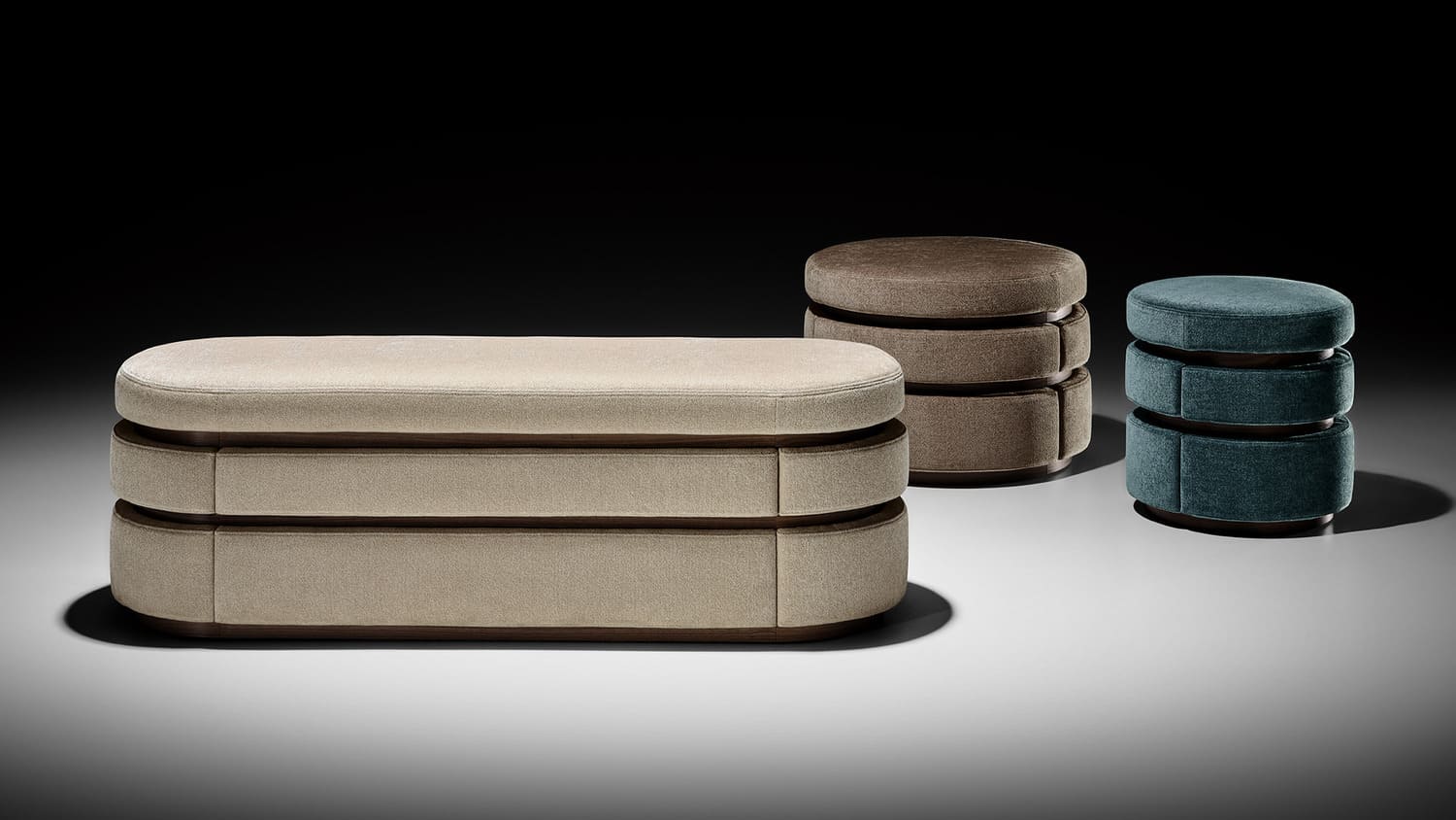 Firmato da Colzani&Novati, Infinito è anche una famiglia di complementi: una panca di grandi dimensioni, due pouf in misure differenti. Tutti condividono lo stesso codice formale, fatto di profili morbidi e proporzioni studiate, in equilibrio tra rigore geometrico e sensibilità estetica.