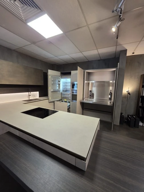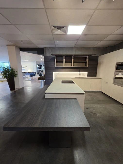 Caratteristiche principali Ante: melaminico argilla Top: laminato Gole: alluminio bronzo Zoccolo: alluminio rivestito Accessori: piano snack in eucalipto, piano estraibile in acciaio