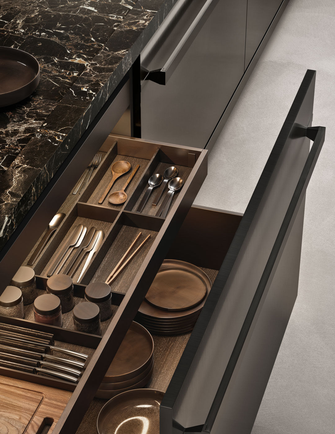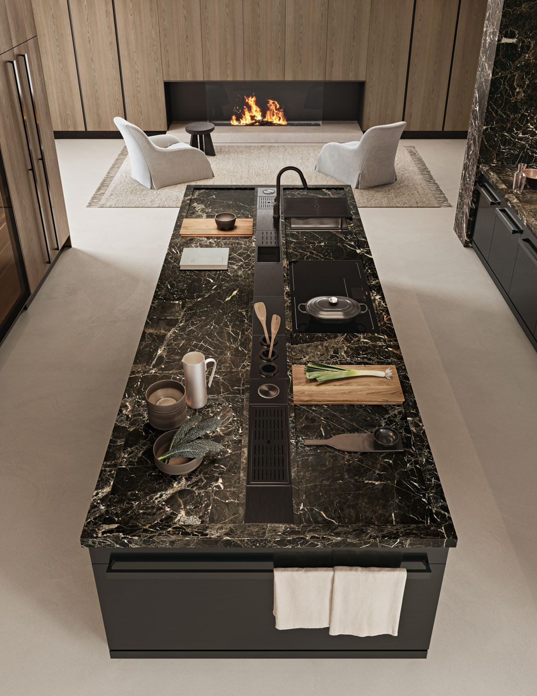 Materiali preziosi come il marmo Noir Saint Laurent opaco e l’acciaio inox PVD Plus black si alternano alle calde finiture in legno fossil oak NTF, creando un perfetto equilibrio tra rigore e accoglienza. La fascia zoccolo Pro e le ante in acciaio donano continuità visiva e solidità architettonica.