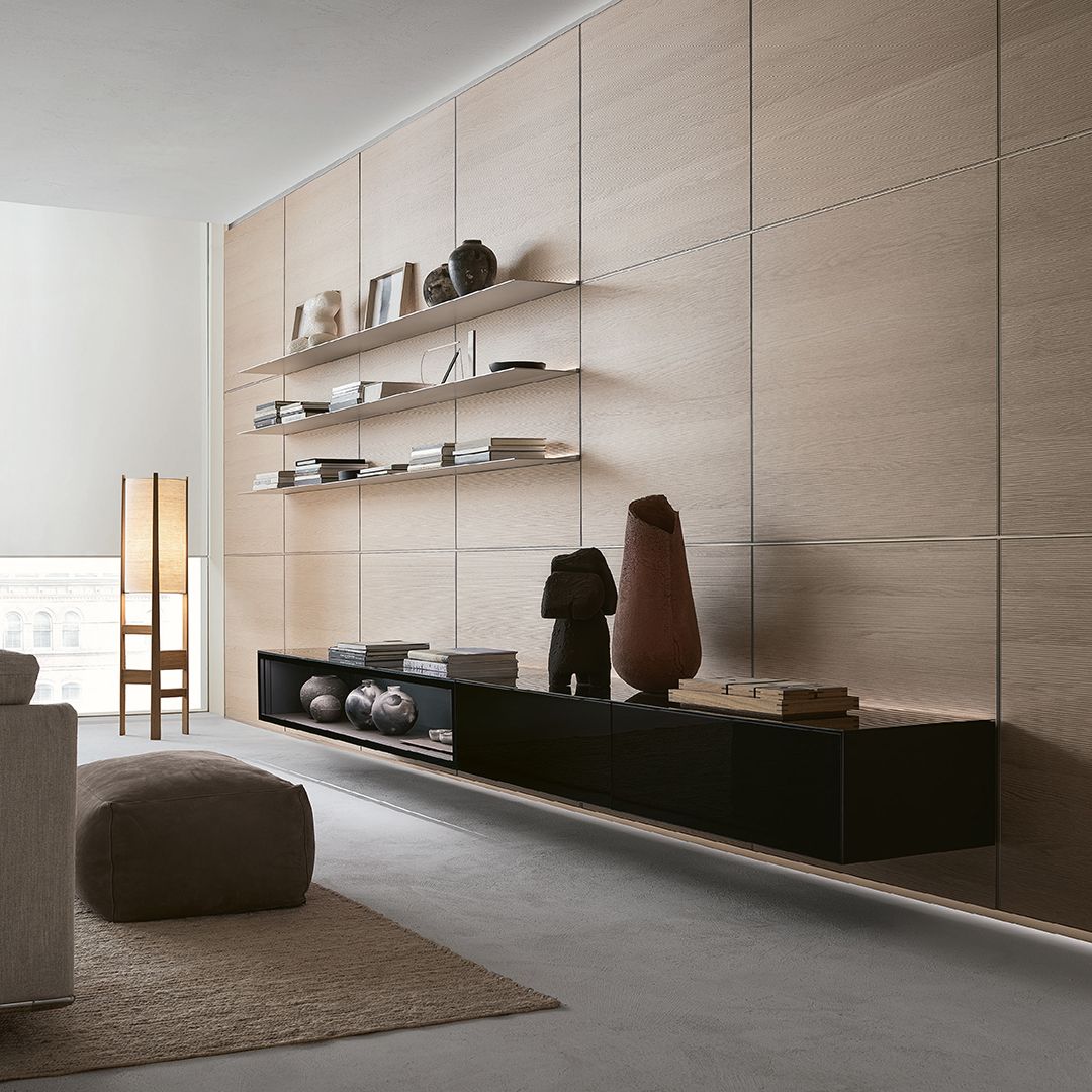 Self si distingue non solo per la sua ampia varietà compositiva, ma anche per i suoi dettagli esclusivi. I cassetti sospesi in essenza, con interni rivestiti in similpelle, aggiungono un tocco di eleganza, mentre la retroilluminazione LED ad alta efficienza luminosa rappresenta una novità importante. Questa tecnologia rispetta le normative europee ERP-Ecodesign, garantendo un’illuminazione ecologica e prestazioni superiori. Disponibile per il sistema Self, Self Plan e mensole Eos, la retroilluminazione LED assicura una luce delicata e funzionale. Il sistema è inoltre dotato di un profilo di aggancio a parete che consente la creazione di composizioni sospese e prevede un’illuminazione integrata, aggiungendo un ulteriore livello di sofisticazione alle composizioni.