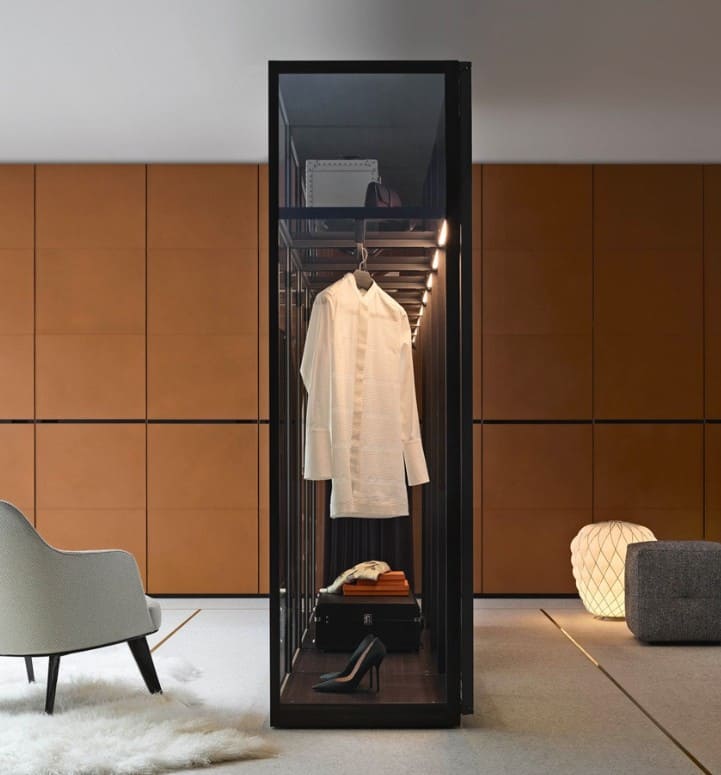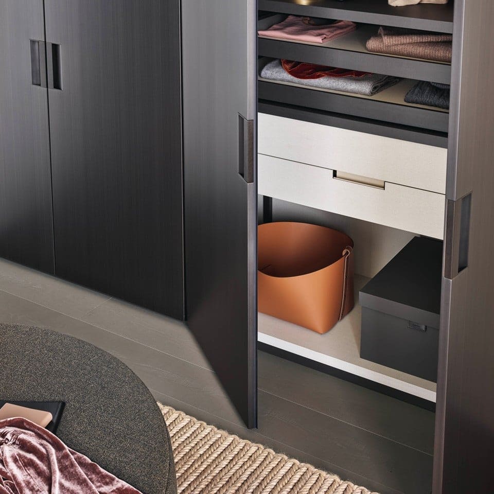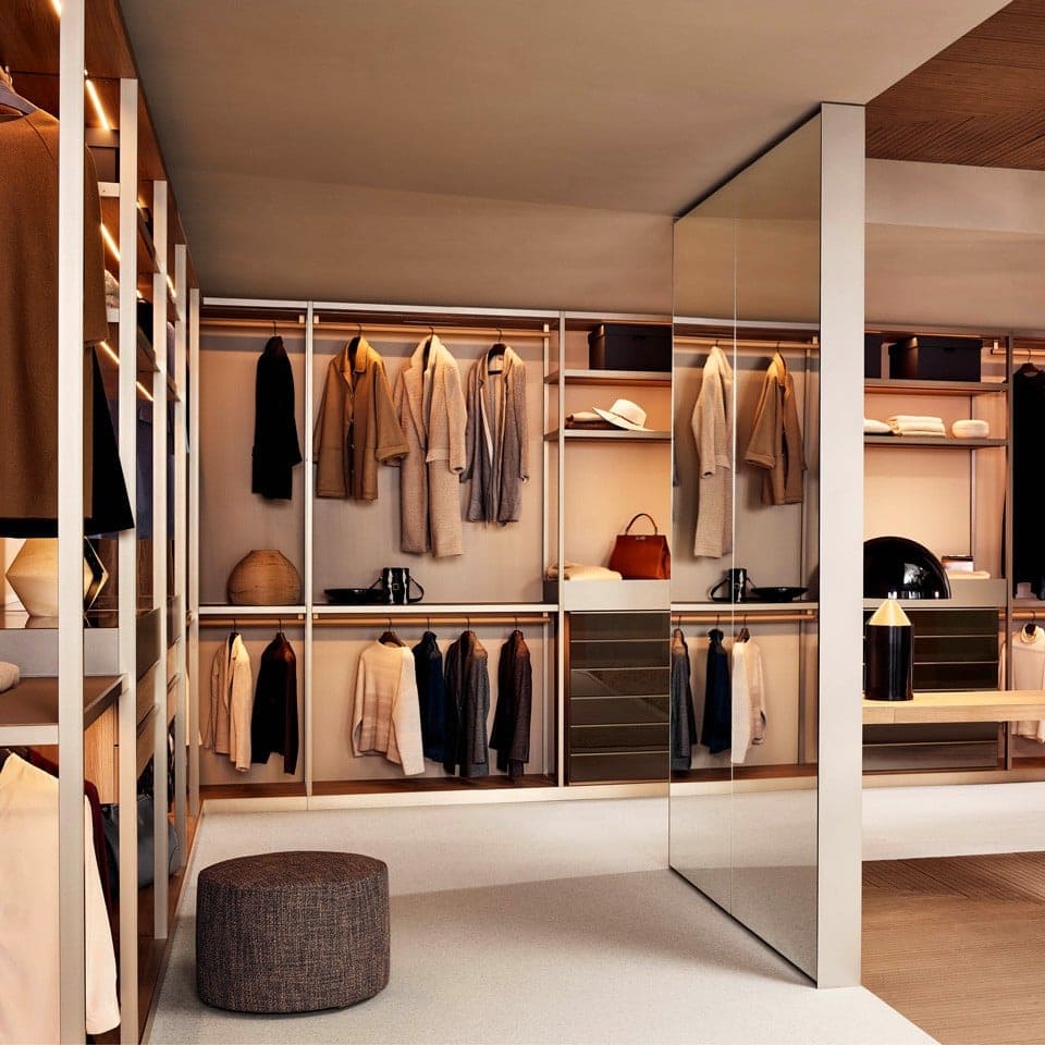 La libertà nelle finiture è totale: dai materiali più tradizionali, come i nobilitati, alle superfici più preziose e suggestive, come il vetro applicato a fianchi, schienali e ante, per creare esclusivi armadi teca. Cassettiere, attrezzature interne e accessori completano il sistema, offrendo funzionalità avanzate e dettagli studiati per ogni esigenza.