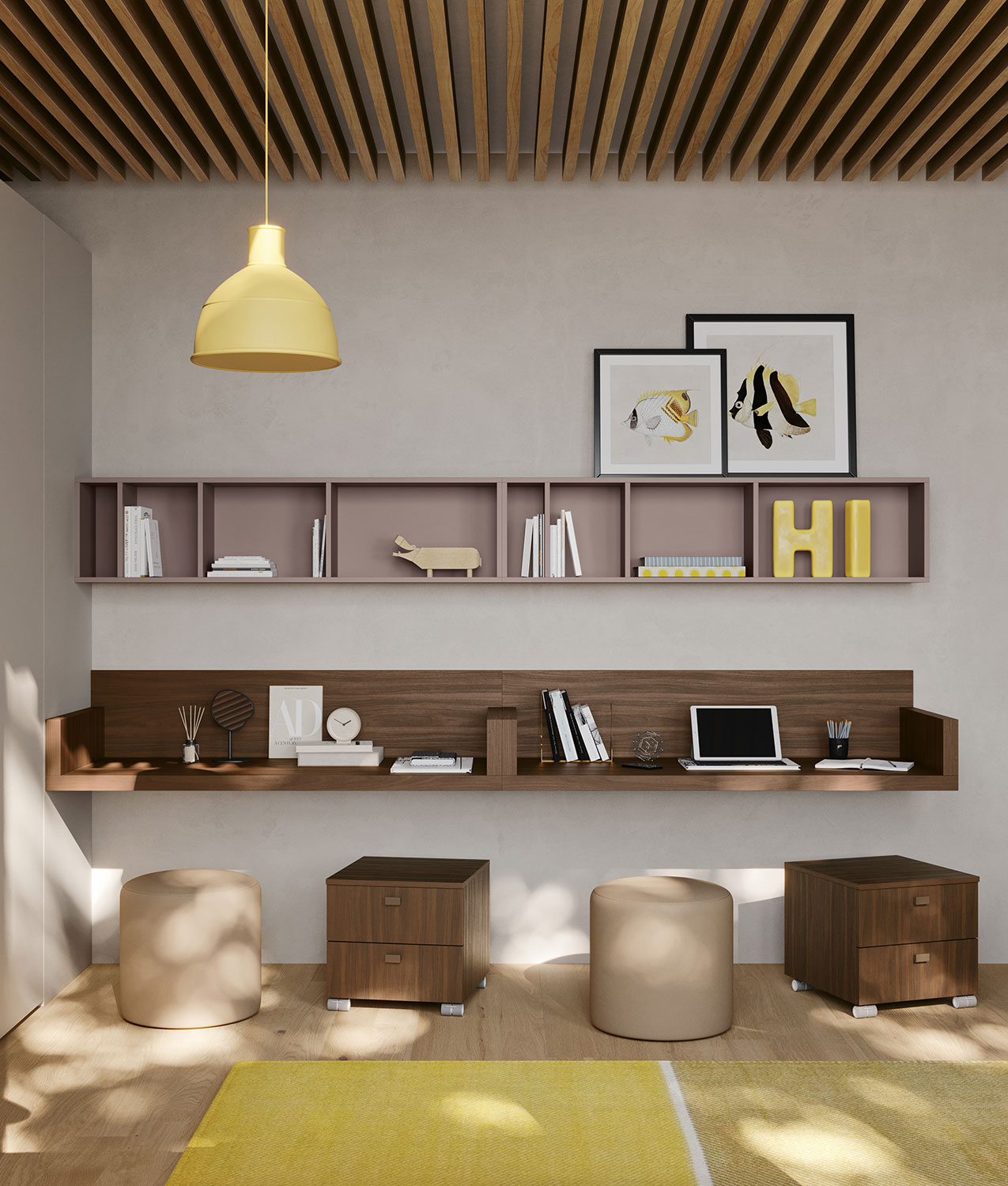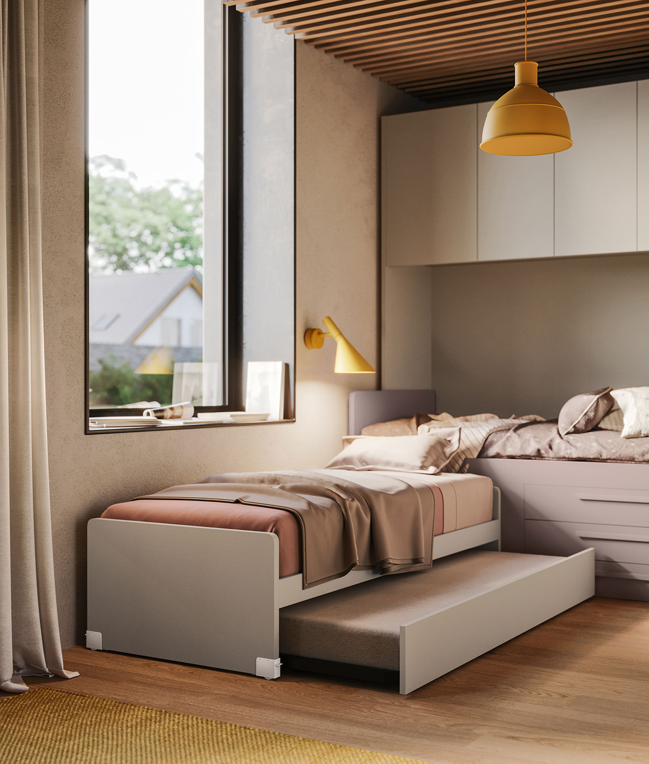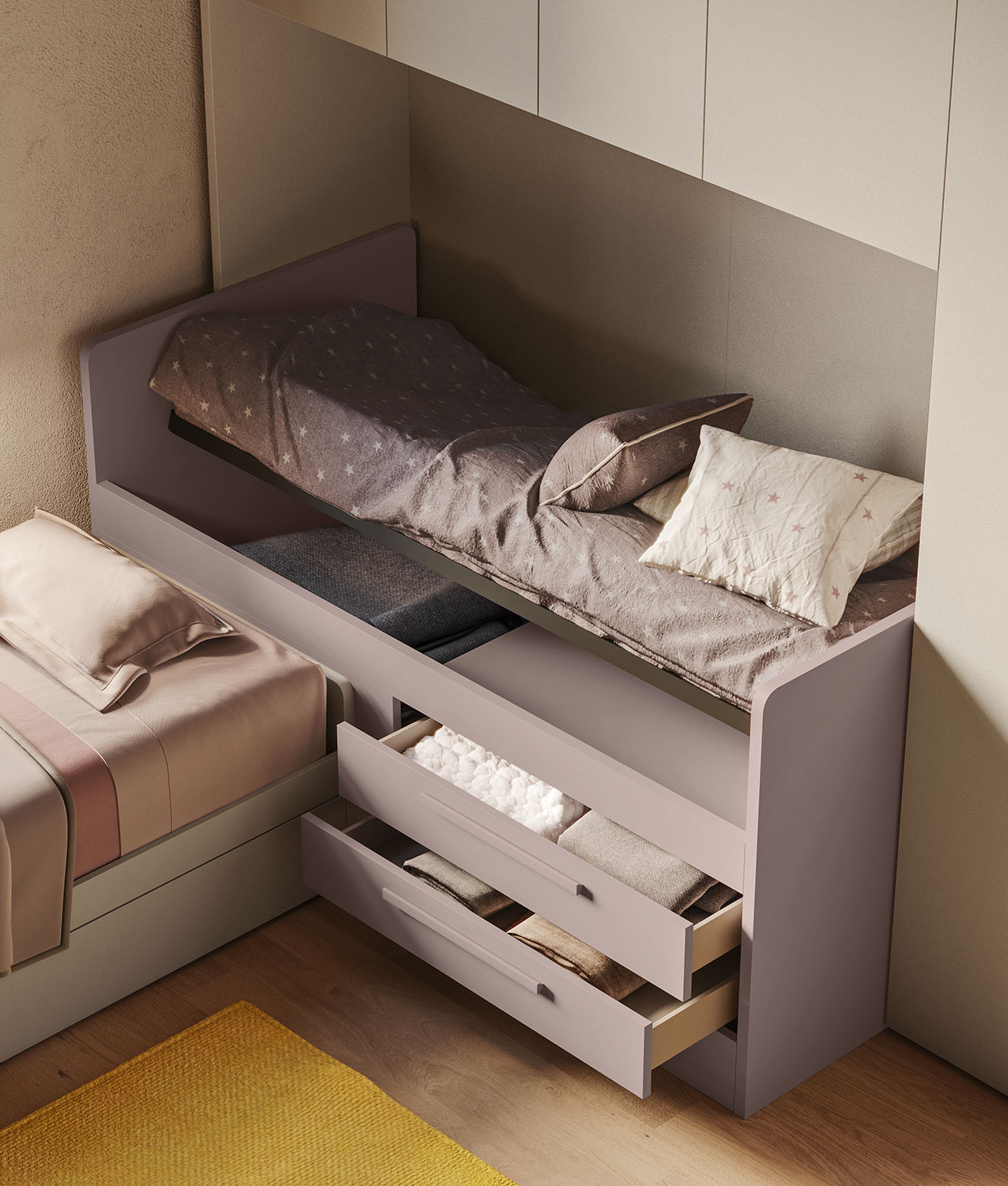 Start P21 è una cameretta a ponte pensata per ottimizzare lo spazio e rispondere alle esigenze di una stanza condivisa. Con tre letti singoli, di cui uno a cassettone, e una parete attrezzata composta da mensole contenitore con schienale, scrittoi sospesi, cassettiere su ruote e pouf imbottiti, questa soluzione è ideale per due sorelle, ma si presta anche come stanza-studio trasformabile in camera per gli ospiti. La composizione è suddivisa in tre aree funzionali: zona notte, zona studio e zona contenimento, offrendo tutto il necessario per dormire, studiare e organizzare gli spazi.