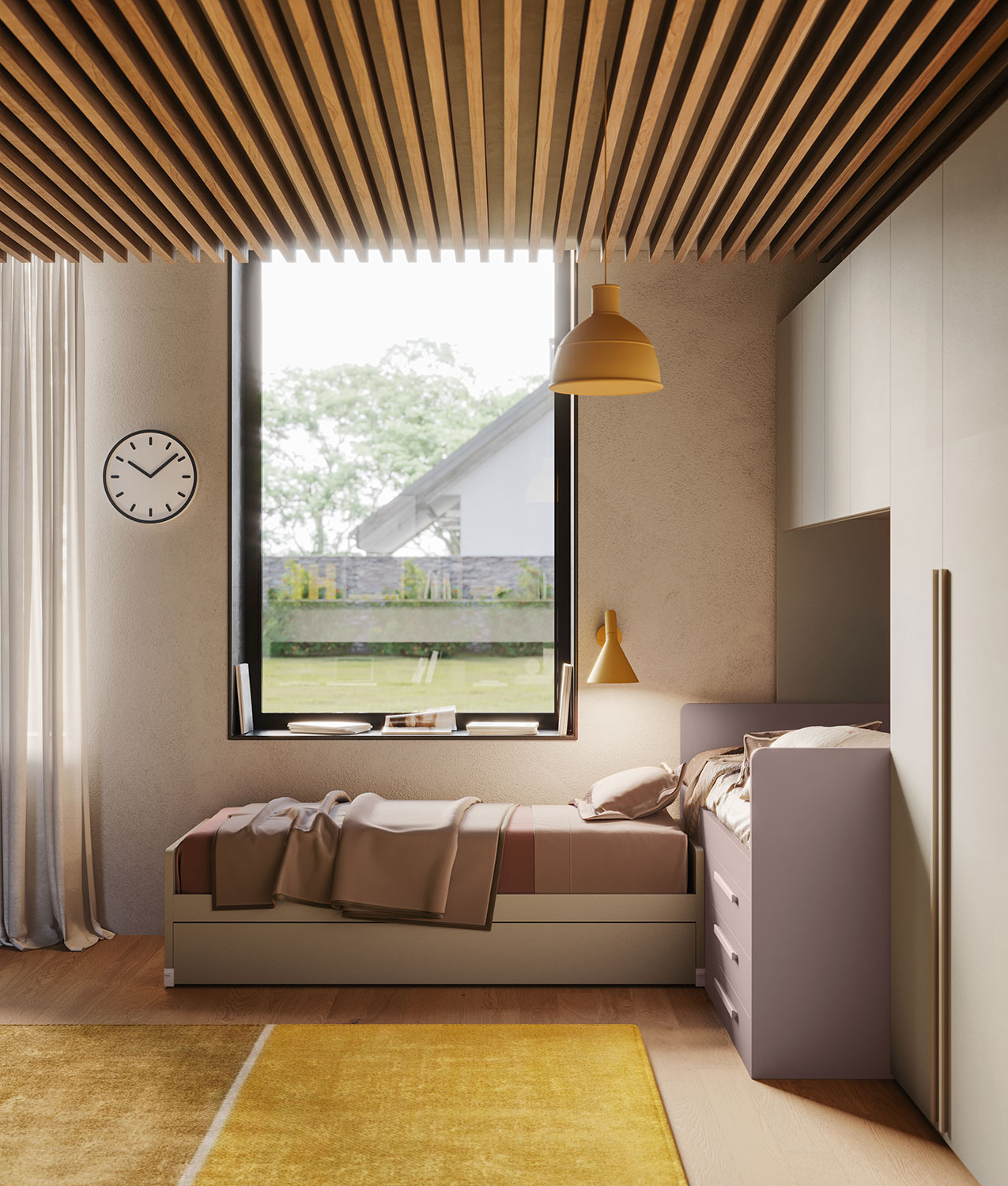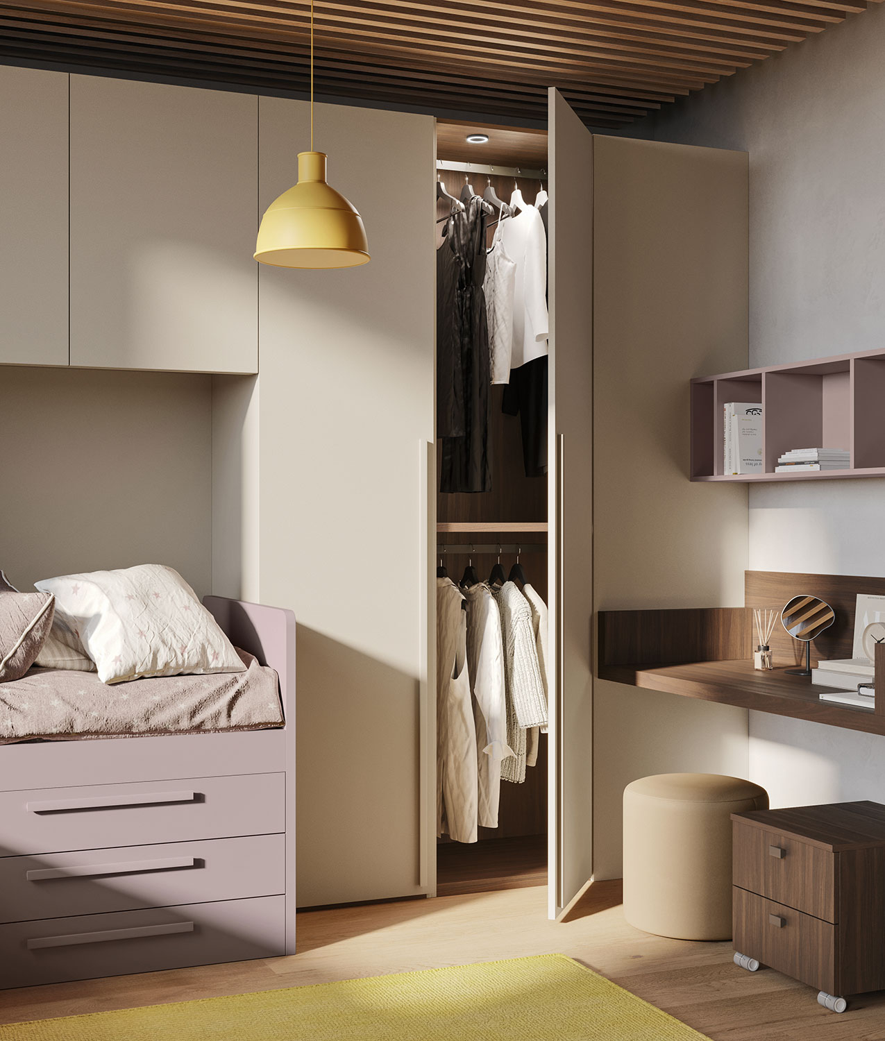 La zona notte è dominata dalla collezione Lobby, con letti polifunzionali che si adattano a diverse necessità. Il letto Lobby Corner è un letto alto sottoponte con vano contenitore e cassetti, mentre Lobby Estraibile è un letto scorrevole con apertura a cassettone e seconda rete. Entrambi offrono grande praticità grazie alla struttura con ruote, che permette di spostare i letti in base alle esigenze. La composizione include anche un grande guardaroba battente con moduli a ponte e vani contenitori attrezzati. La stanza è arricchita da due scrittoi sospesi, due casellari e due cassettiere, creando una parete attrezzata simmetrica che garantisce a ciascun componente uno spazio dedicato. Le camerette componibili Clever sono completamente personalizzabili in dimensioni, disposizione, colori e finiture, per adattarsi perfettamente alle esigenze di ogni famiglia.