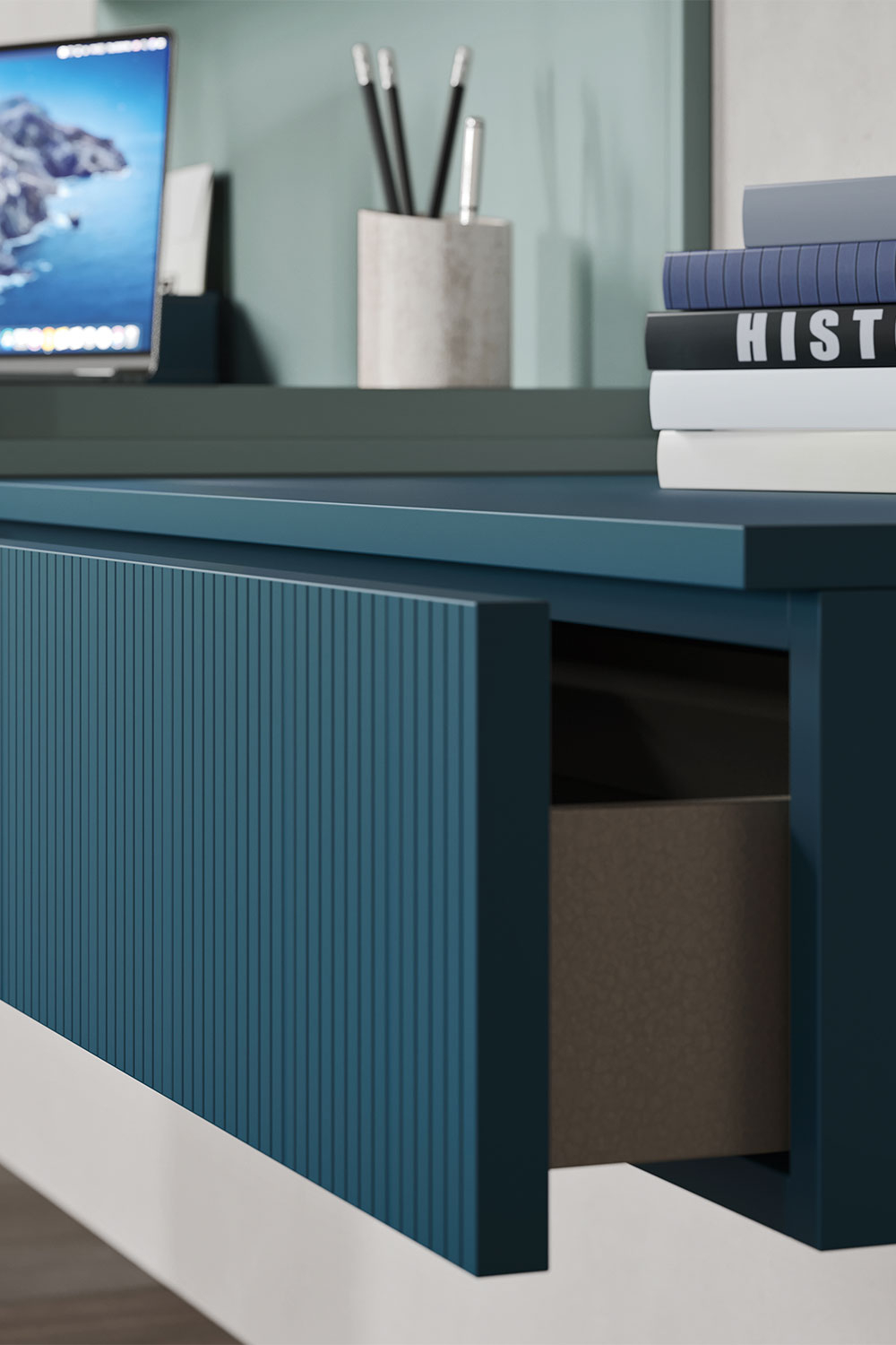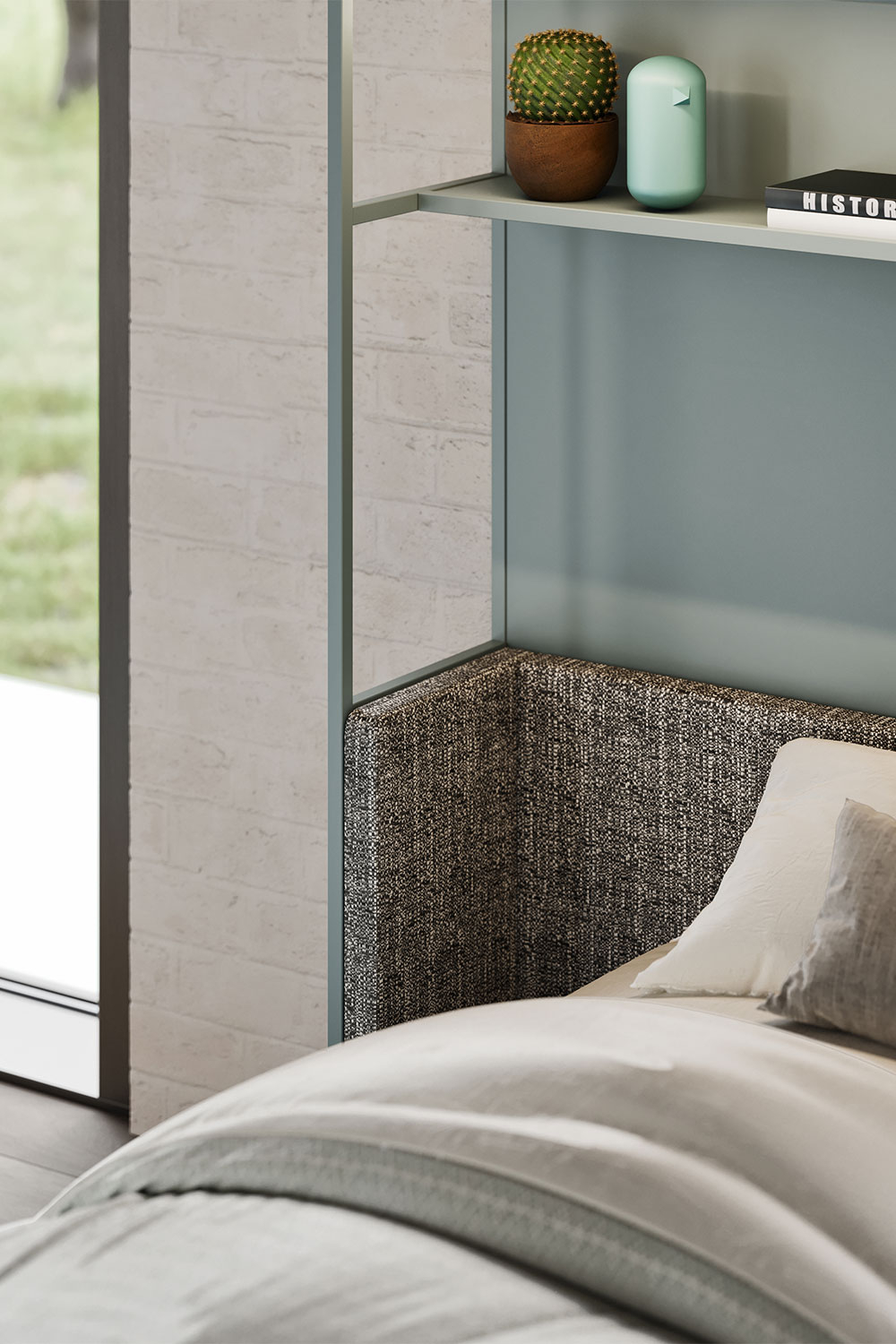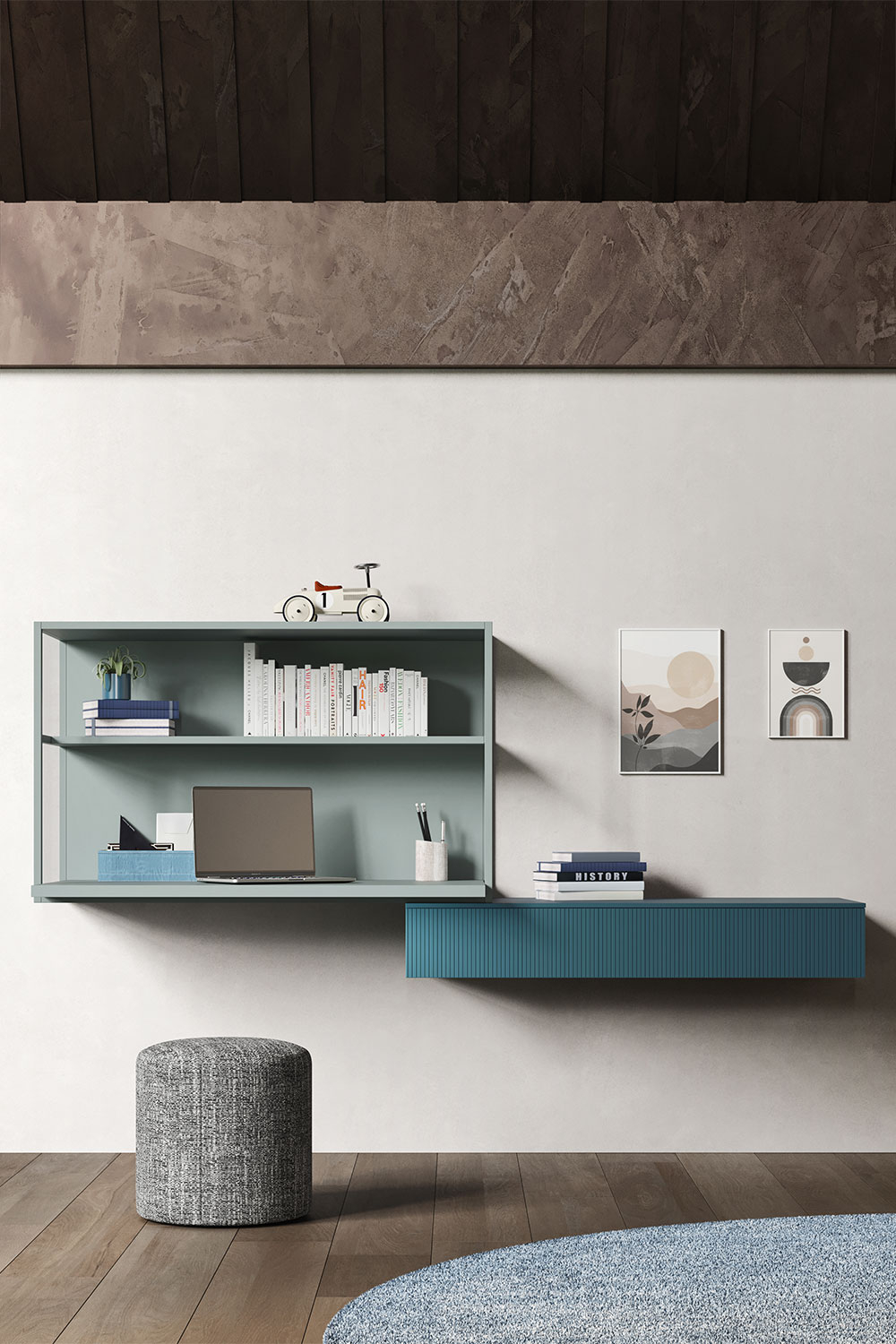 Il letto sospeso è accompagnato dal Kios, uno scrittoio a parete dal design minimalista che aggiunge un tocco decorativo all’angolo studio. Il piano di lavoro è arricchito da un cassetto sospeso con un frontale scanalato dal forte impatto visivo. La zona guardaroba è stata ripensata con una soluzione modulare che alterna moduli pieni e vuoti, colonne contenitore e appenderia sospesa, offrendo una maggiore capacità di stoccaggio in modo flessibile. Il vano centrale dell’armadio è allestito con accessori interni come cassetti, ripiani e luci integrate, mentre l’armadio sospeso accanto al letto, sebbene più piccolo, è altrettanto funzionale. Ogni dettaglio estetico, come i complementi Kios, è pensato per creare un’armonia cromatica e formale che attraversa tutta la stanza, offrendo una soluzione coerente e personalizzabile in ogni aspetto.