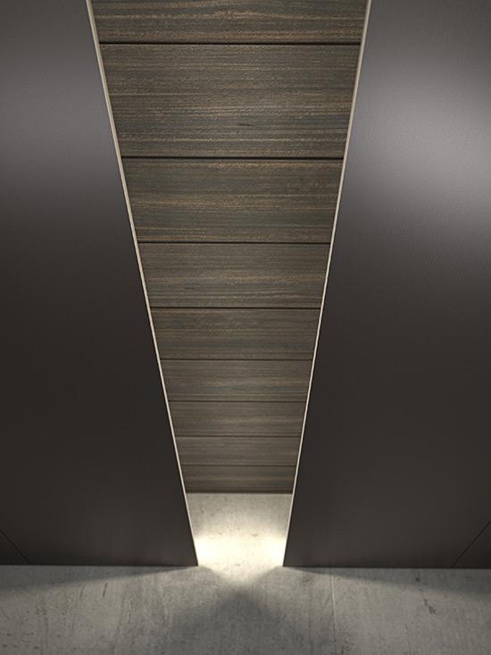 Piccoli dettagli che esaltano il valore dell’intero progetto Il progetto si distingue per una forte personalità, che unisce con sapienza volumi e materiali, creando un equilibrio perfetto tra estetica e funzionalità. L’illuminazione a LED del piano di lavoro, completamente integrata nella boiserie, non è solo un elemento pratico, ma arricchisce l’ambiente, creando un’atmosfera unica. La nicchia tra le colonne, anch’essa illuminata, interrompe il volume di contenimento, aggiungendo dinamismo e allo stesso tempo valorizzando l’intero spazio circostante. Gli spessori sottili, un leitmotiv dell’intero progetto, sono enfatizzati dalle mensole in ferro, che con i loro soli 3 mm di spessore diventano un dettaglio distintivo ed elegante.