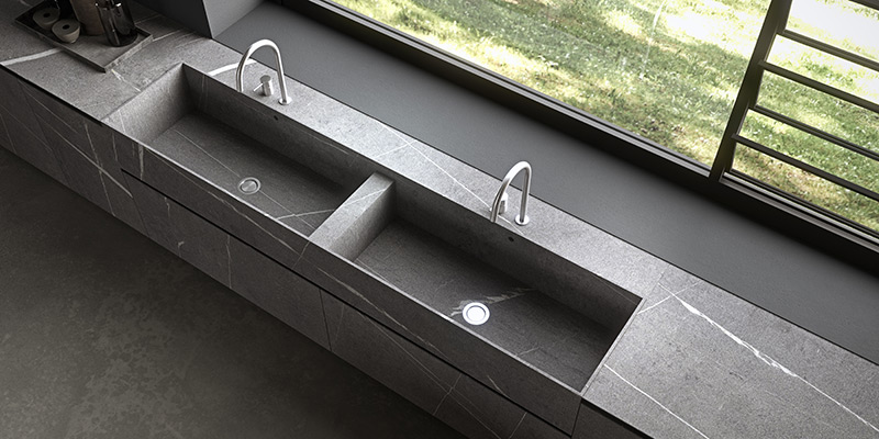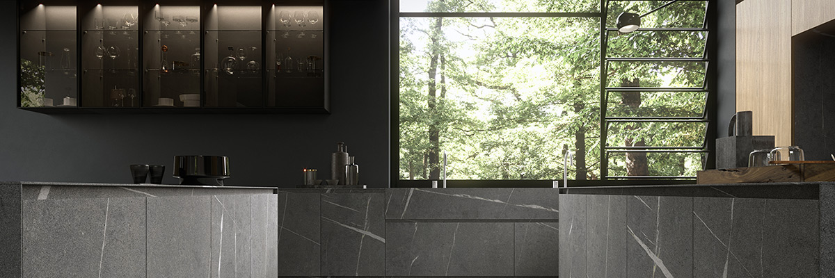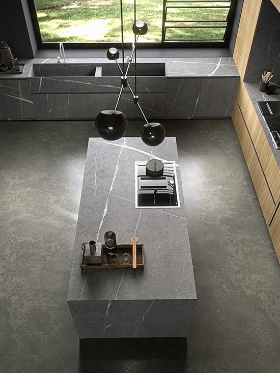 Gli spazi sono progettati per essere ergonomici, funzionali e ben definiti. Il gres ricopre tutte le aree operative della cucina, donando un aspetto raffinato e al contempo molto resistente, perfetto per un ambiente che richiede alte performance e una manutenzione minima. Sotto la superficie di questa composizione apparentemente minimalista, c’è una cura meticolosa dei dettagli. Un disegno architettonico rigoroso e una progettazione tecnica accurata fanno di questa cucina un ambiente ricco di soluzioni ingegnose e sofisticate, pur mantenendo un’estetica semplice e lineare. Il tavolo Twenty completa l’ambiente con un design che non passa inosservato: il piano in rovere ossidato si integra perfettamente con le basi della cucina, creando una continuità visiva e funzionale. Il progetto seduce per la sua disarmante semplicità, priva di elementi decorativi superflui, ma arricchita dalla scelta di finiture esclusive come la pietra piasentina. Questa apparentemente “imperfetta” materia esprime la naturalezza della sua essenza, rappresentando una vera e propria filosofia di vita, basata sull’autenticità e non su mode o tendenze passeggere.