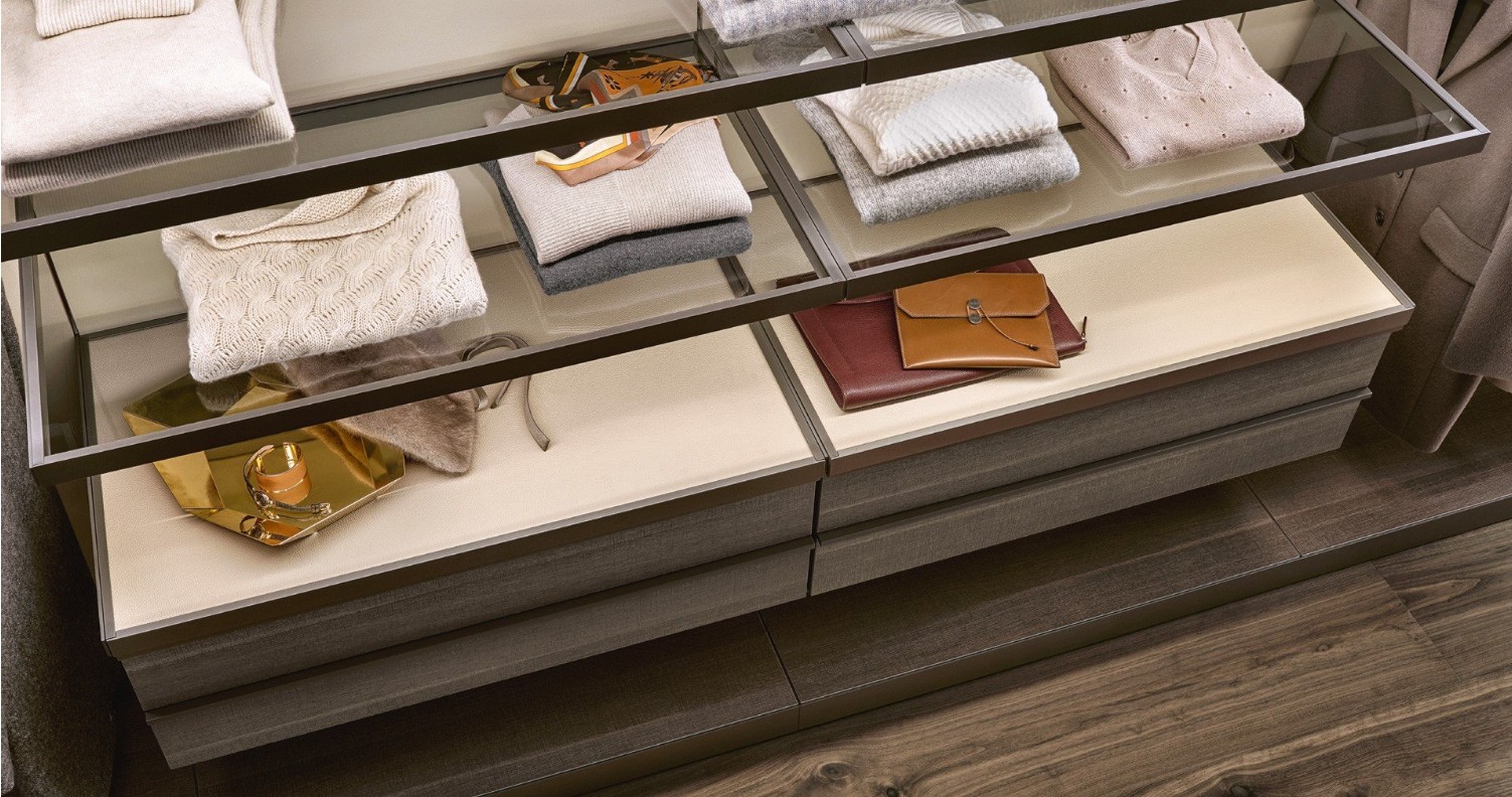 La struttura di Ubik si compone di un sistema di pannelli a parete, disponibili in diverse finiture, che possono essere combinati o sostituiti dai profili con cremagliera, completati da ripiani e attrezzature. Le finiture dei pannelli definiscono l’estetica della cabina armadio: classica con boiserie in nobilitato legno, sofisticata in vetro, esclusiva nelle varianti effetto tessuto o tecnocover.