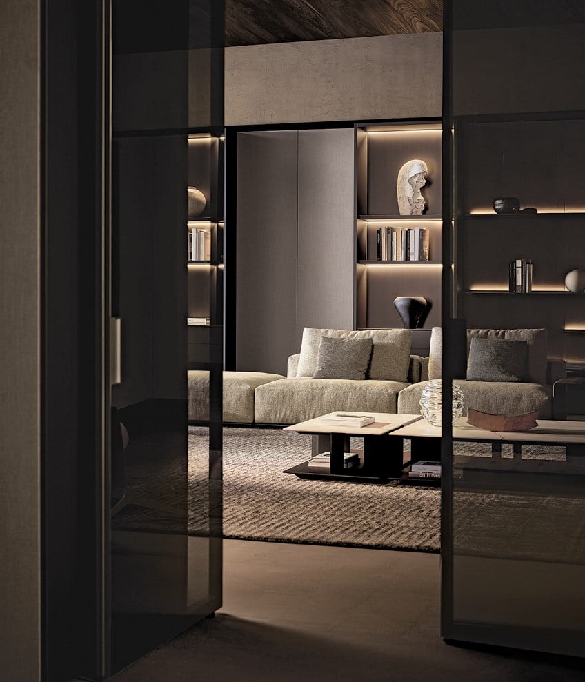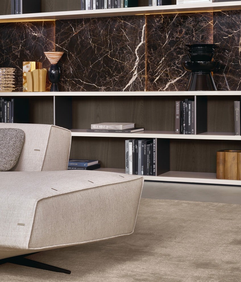 Wall System si arricchisce di numerosi elementi che ampliano la funzionalità del sistema, come ante battenti, scorrevoli o a ribalta, ideali per creare angoli bar o spazi dedicati all’home office. Le vetrine e le teche permettono di esporre oggetti e opere d’arte, mentre i cassetti e i portali TV aggiungono ulteriore praticità. La varietà di finiture disponibili, tra cui il marmo pregiato, consente di personalizzare ogni composizione, dando vita a soluzioni uniche che rispecchiano perfettamente lo stile e la personalità di ogni ambiente.