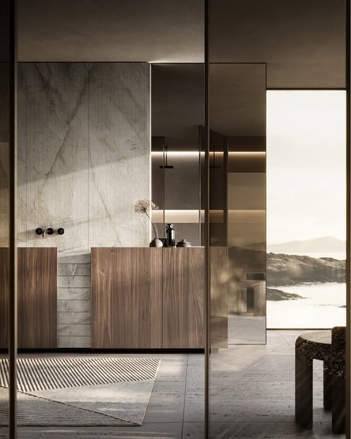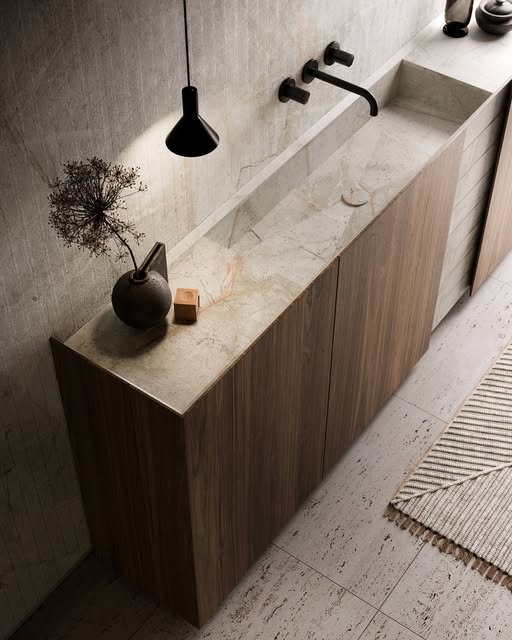 Il cuore della composizione è rivestito in marmo Appennino nelle calde tonalità della finitura «Sense», scelta per la sua matericità che coinvolge vista e tatto. Il top di 10 cm e il pannello posteriore con doghe esaltano la naturale bellezza delle venature, estendendosi anche sulla parete di fondo, interamente rivestita nello stesso materiale.