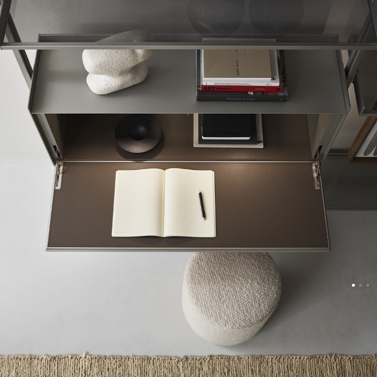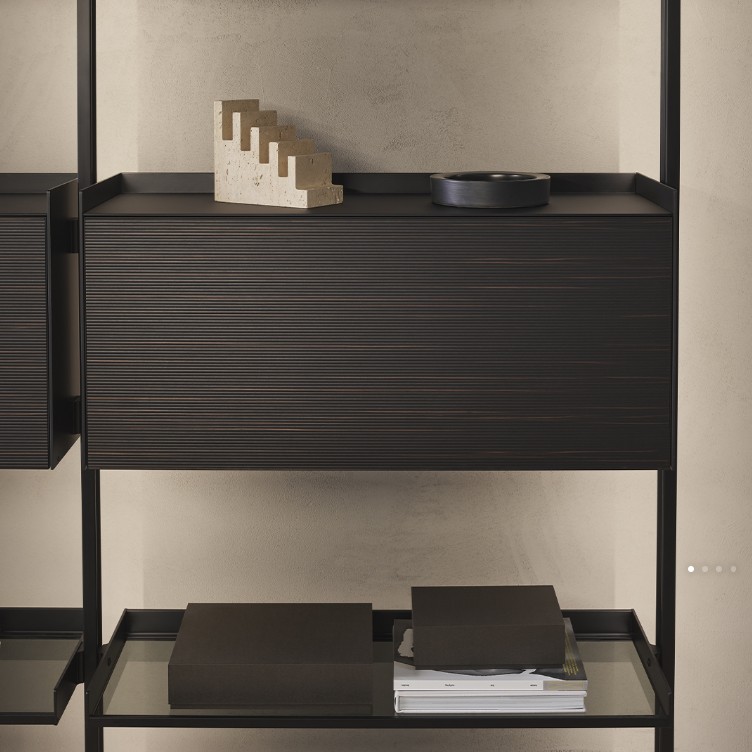 Questa libreria amplia ulteriormente le sue potenzialità progettuali con l’introduzione di montanti retroilluminati, che donano profondità e atmosfera, e di contenitori sospesi, liberamente posizionabili come ogni altro elemento del sistema. I cassetti in alluminio, dotati di guide ad estrazione totale, si distinguono per l’innovativo sistema di apertura push e rientro ammortizzato, che unisce praticità e raffinatezza nei dettagli.