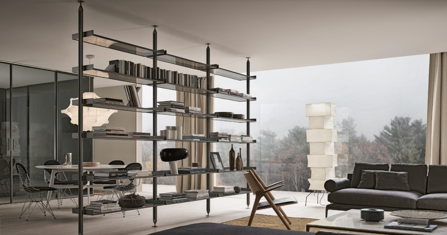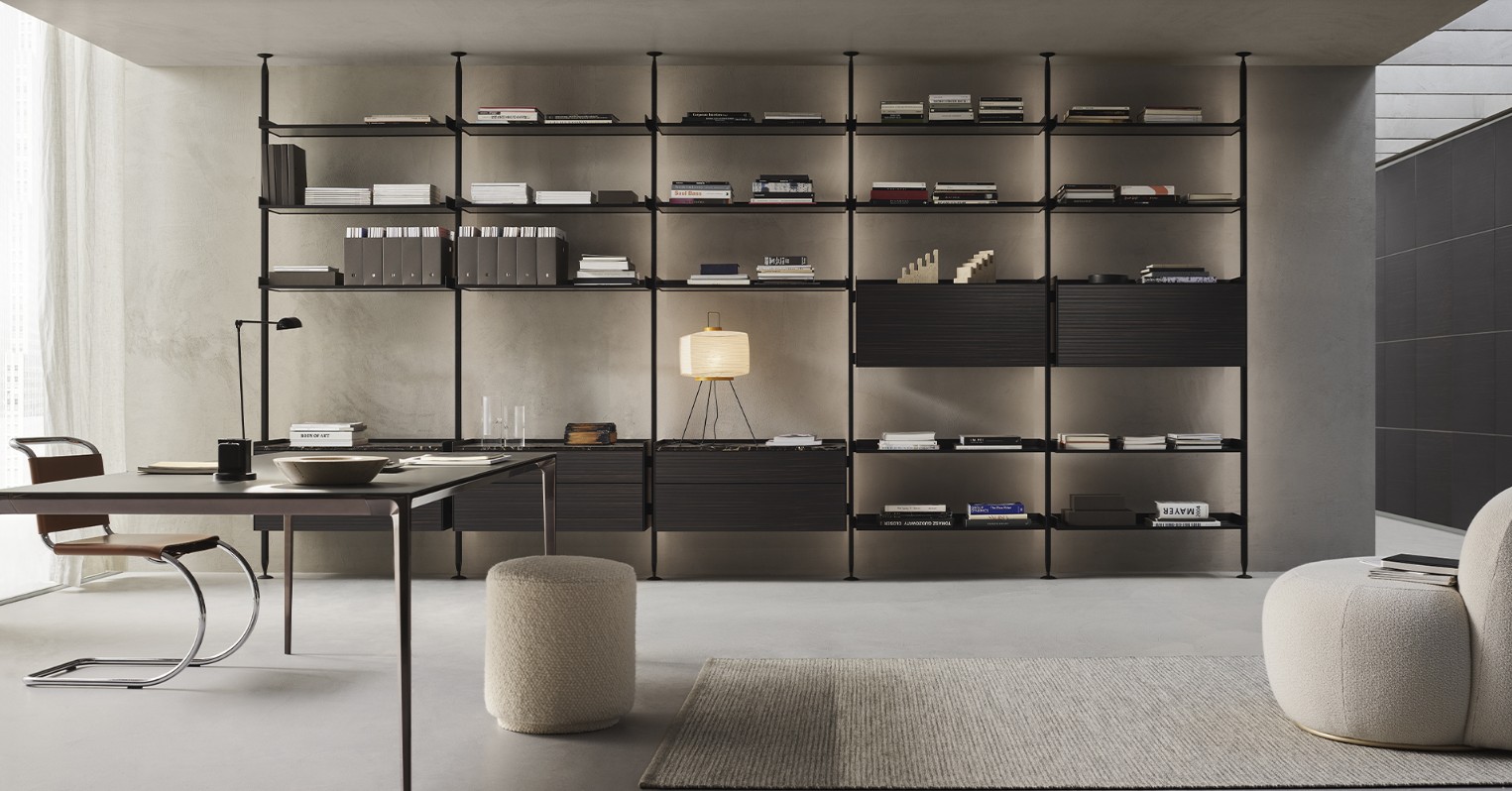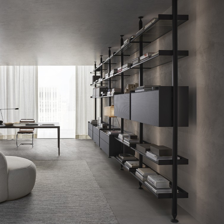 Una libreria progettata all’insegna della leggerezza visiva e della massima libertà compositiva. I montanti, realizzati sempre su misura e fissati da terra a soffitto, offrono la possibilità di disporre liberamente mensole, contenitori e attrezzature, sia nel numero che nell’altezza desiderata, per creare soluzioni perfettamente adattabili a ogni spazio. Un sistema pensato per esporre e contenere, ideale sia per ambienti domestici sia per contesti professionali, capace di coniugare eleganza e funzionalità.