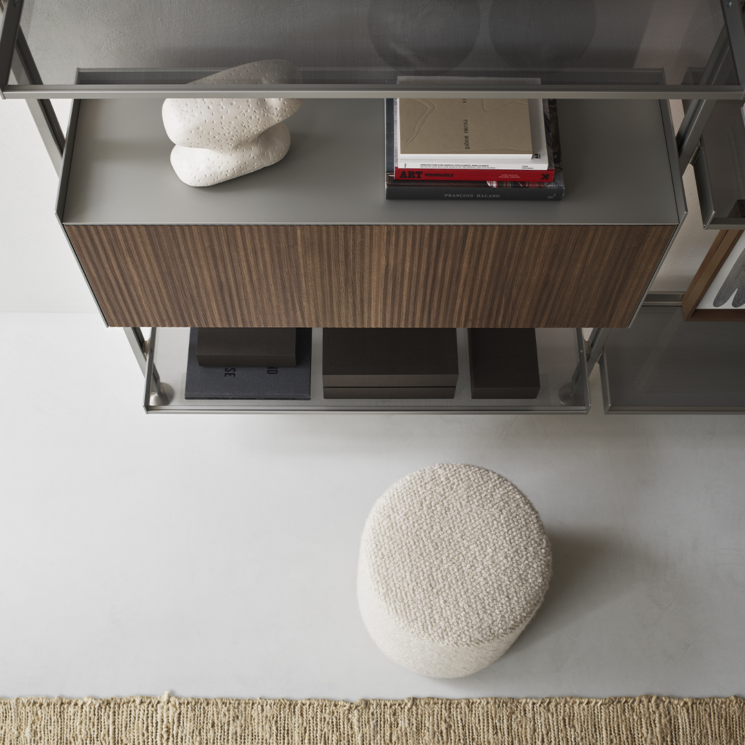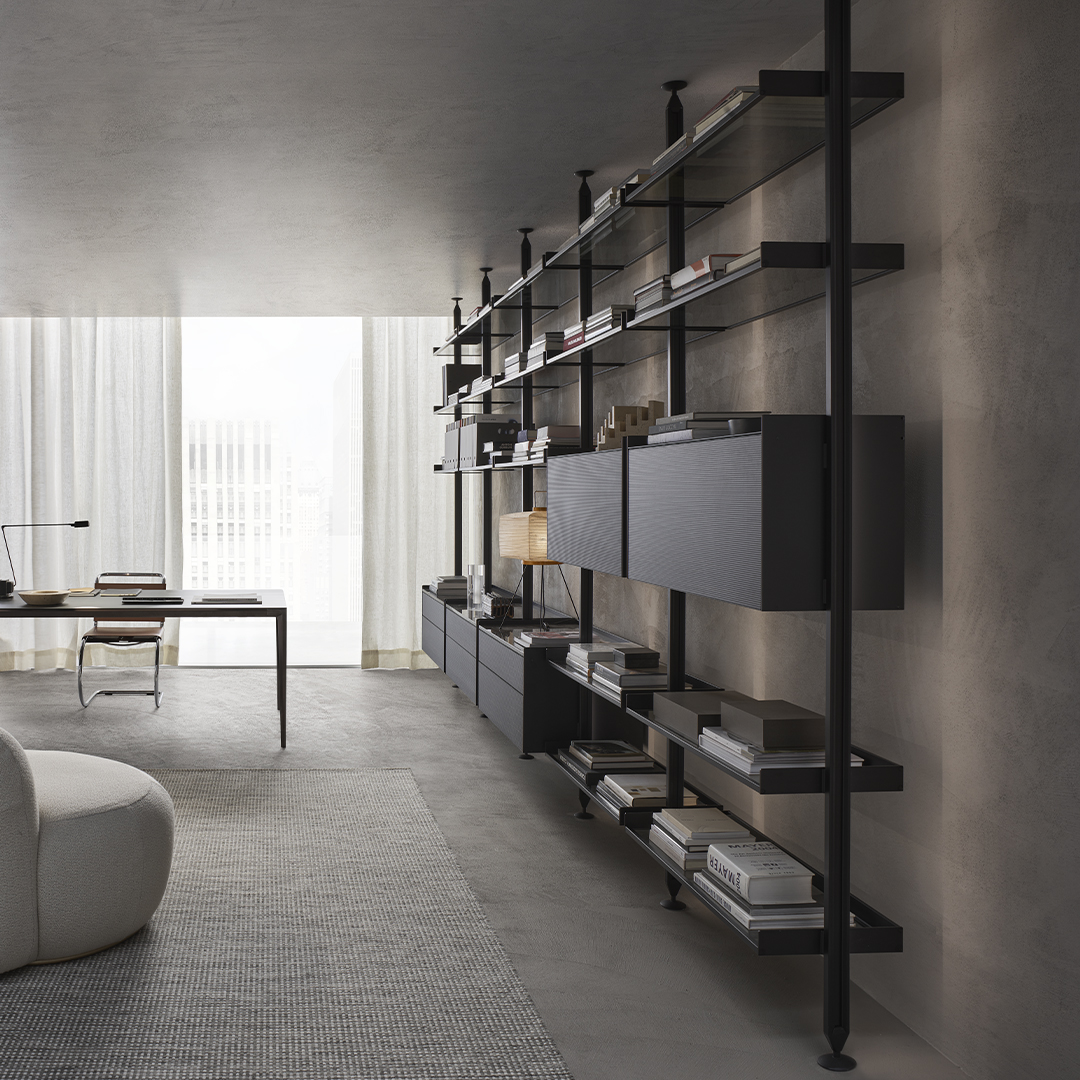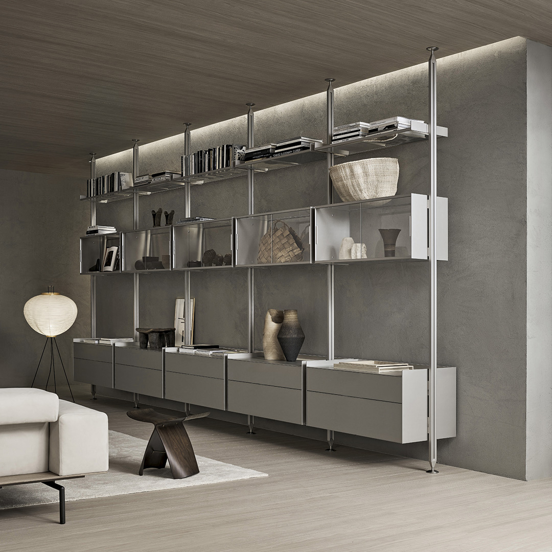 La libreria Zenit si distingue per la sua leggerezza visiva e la straordinaria versatilità compositiva. I montanti, sempre su misura e fissati da terra a soffitto, permettono di disporre liberamente gli elementi, sia in numero che in altezza, adattandosi perfettamente alle esigenze del contesto. Pensata per esporre e contenere, Zenit è la soluzione ideale sia per la casa che per gli spazi professionali, grazie alla sua capacità di integrarsi in ambienti di ogni tipo. La varietà di finiture, che spaziano dal vetro alle essenze, fino alle superfici in alluminio, consente una perfetta armonia stilistica con ogni arredamento.