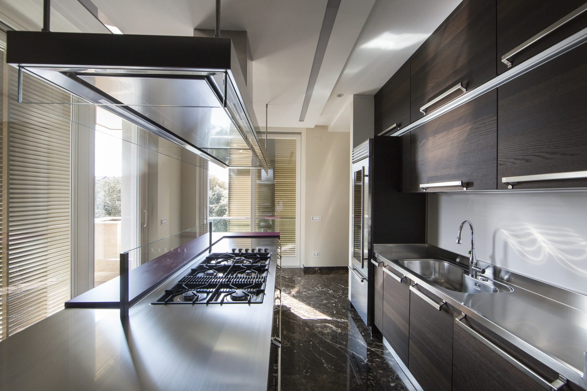 Attraversato il corridoio, si apre un ampio salone a vetrate con vista su Castelvecchio, dove insiste un grande terrazzo. BALLARINI INTERNI ha proposto un arredamento raffinato ed elegante, affidato a marchi di prestigio, come il design di Maxalto, B&B Italia, per i suoi divani e mobili, giocati nei colori delle terre e del vinaccia, che bene si coniugano con i pavimenti in marmo marrone scuro.