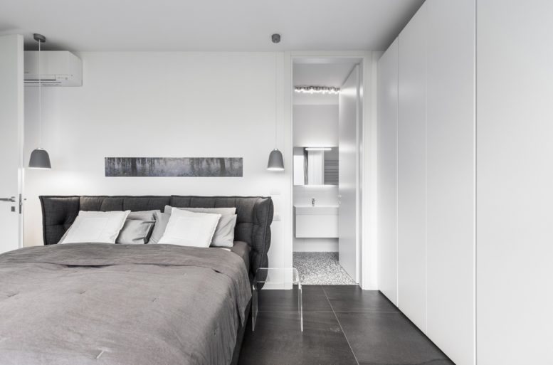 Il progetto d’interni prevede una superficie muraria di tonalità bianco o grigio chiaro che rifletta ed espanda l’abbondante luce proveniente dalle vetrate continue affacciate sul lago.