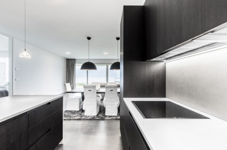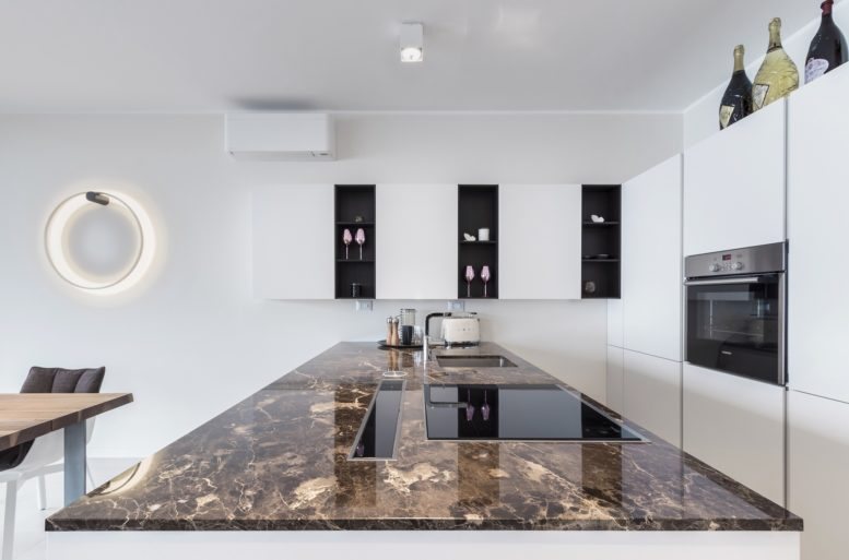 La soluzione d’arredo, curata da Ballarini Interni, è un’accurata alternanza di superfici e colori diversi su una base di tinta bianco. Si può infatti notare nell’ampio soggiorno una tonalità chiara uniformemente diffusa, in cui spiccano gli elementi d’arredo ciascuno contraddistinto dal suo particolare colore e utilizzo del materiale. Il divano color grigio cenere, il tavolo da pranzo in legno color nocciola, il rivestimento della cucina in legno più scuro.