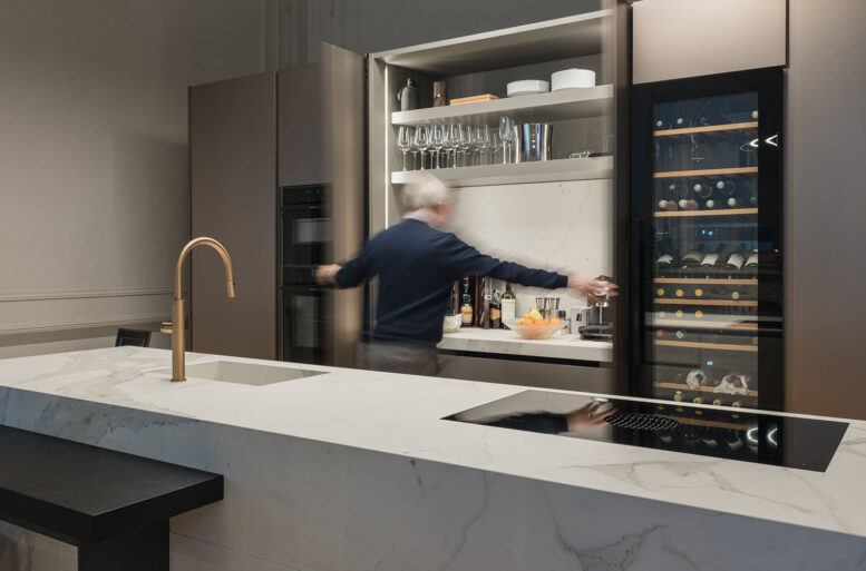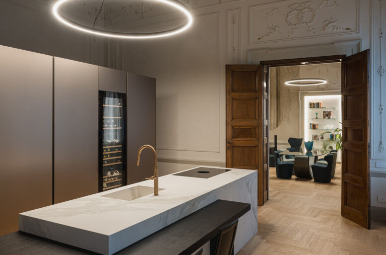 Concludiamo con un must have di Ballarini Interni che sceglie MODULNOVA per le proprie cucine. Qui troviamo il modello Blade Lab, una cucina in pietra che rappresenta l’apice dello stile MODULNOVA che, grazie alla ricerca e dalle nuove tecnologie, riesce a trasformare un materiale notoriamente pesante in qualcosa di leggero ed estremamente raffinato. La versione scelta per questa installazione prevede un isola in Gres Calacatta e le ante Leafmetal Ivory. Questo delicatissimo intervento dalla raffinatezza ed eleganza uniche, dimostra come con sensibilità e professionalità sia possibile fondere alla perfezione la memoria storica di un luogo con degli arredi moderni ed innovativi, senza rinunciare al comfort ed alla bellezza del design made in Italy.