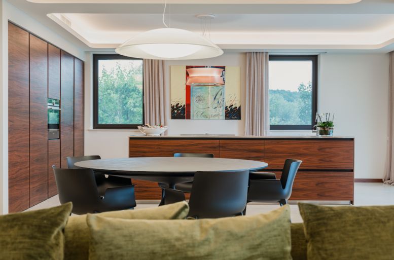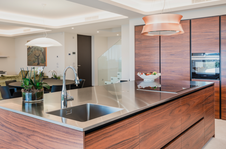 La committenza, una coppia dinamica, con gusti eleganti ed esigenze pratiche, per questo Ballarini propone arredi su misura, pensati per sfruttare gli spazi in modo totale. La cucina, il centro di questa abitazione, spazio di incontro e condivisione, e Ballarini Interni sceglie di armonizzare gli spazi con un tocco sartoriale, scegliendo aziende che garantiscono la massima personalizzazione di forme, finiture, misure e distribuzioni, per creare uno spazio unico sia in estetica che in ergonomia. La scelta, ricaduta su di un’essenza di palissandro con venature orizzontali, prestando particolare cura alla continuità delle stesse sui diversi pannelli che compongono i lati.