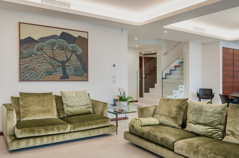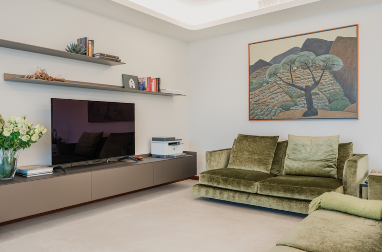 Ballarini Interni propone uno stile versatile e lineare, con la scelta di superfici materiche e colori naturali, anche nella zona living. Qui troviamo marchi italiani di eccellenza come il divano Flexform, la nota di colore che serviva, delicato ed accogliente in velluto cangiante verde, modello Long Island, che definisce morbidamente la zona soggiorno, illuminando l’ambiente. Un altro disegno pulito ed essenziale con superfici pure e continue, il sistema d’arredo sospeso Rimadesio, scelto per la zona tv, espressione di essenzialità e contemporaneità. Le geometrie assolute del sistema Self Bold si inseriscono con eleganza e personalità nello spazio. Il top, uno dei tratti distintivi della collezione e le superfici in vetro satinato bronzo ne caratterizzano l’unicità, donando luce e classe a tutto l’ambiente. Ballarini Interni, avvalendosi dei migliori designers, ha interpretato questi spazi con eleganza e cura per il dettaglio, come la ricercatezza delle superfici, dei colori e la linearità delle forme, rendendo questa villa unica nella sua personalità, rispecchiando i gusti e le esigenze personali di chi la abita.