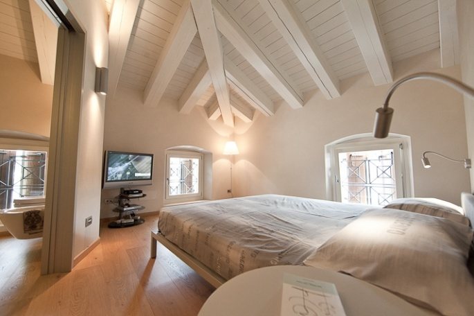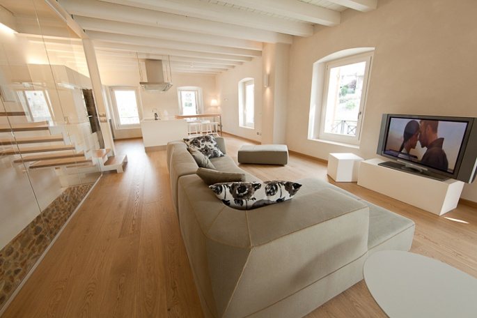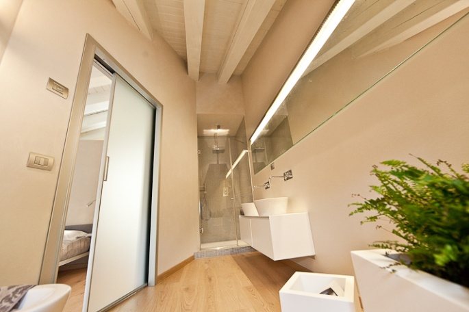 «Probabilmente lo stabile, fino al secolo scorso, era una sorta di deposito di materiale che arrivava dal fiume e il cortile il porto di approdo. – ci spiega l’architetto Nicola Cacciatori, autore del restauro – L’edificio aveva già subìto una ristrutturazione, verso la fine degli anni Ottanta, che aveva portato alla creazione di due unità residenziali. Quando li vidi per la prima volta, nel 2009, subito notai con rammarico che dagli appartamenti non si poteva gustare appieno la vista dell’Adige, vista la scarsità di finestre e l’illuminazione naturale. Le poche e piccole finestrelle esistenti erano poste in posizioni dove anche l’arredo ne ostacolava la vista. » Insomma il fiume, elemento naturale così importante e caratteristico, era stato escluso dalla quotidianità e dalla familiarità degli abitanti, ma come dimenticarlo e non farne invece un punto di forza? Come scordare la gioia e la paura della piena, l’uso delle paratie, la corrente che raffresca durante l’estate? Ai proprietari non sfugge la straordinarietà suggestiva di un luogo così singolare e decidono di ridare alla propria casa il fascino della simbiosi con la natura: più luce e piena vista sul fiume.