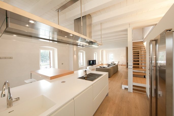 La quasi monocromia degli spazi e i pochi materiali usati (legno per il pavimento, intonaco e tinteggiatura a calce, travi del solaio, porte e opere in ferro laccate bianche) scandiscono i ritmi architettonici in modo fluido e naturale, così che lo spazio creato sui tre piani sia apparentemente lo stesso, seppur con funzioni diverse e ben definite.