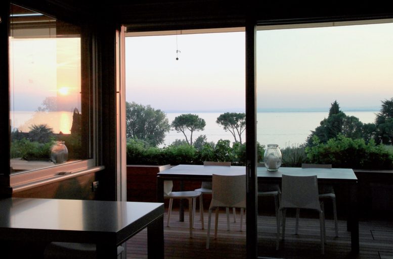 Il lago nel loft. L’esperienza progettuale di questo loft open space con terrazza panoramica sul lago di Garda parte da qui: dalla volontà di portare i quadri naturali che si creano nell’arco della giornata all’interno delle mura domestiche. Pochi materiali in armonia tra loro e ad ogni materiale una connessione: il ferro per l’eleganza e la forza; la pelle per il calore e l’ospitalità; l’avvolgente e discreta resina per accogliere ed abbracciare il tutto. Il restyling di questo elegante e moderno loft, curato dagli architetti Claudia Brentegani e Federico Bertoldi dello studio BC+V, è stato una vera sfi da: l’appartamento era molto piccolo e non aveva spazi adeguati alle esigenze del proprietario, ma soprattutto non sfruttava minimamente la magnifica vista lago che si può ammirare dalle vetrate e dall’ampia terrazza. “Abbiamo cercato di immaginare un luogo quasi etereo, che lasciasse spazio ai riflessi di luce che si possono godere nel corso delle ore del giorno. Allo stesso tempo i materiali e i colori avrebbero dovuto caratterizzare la forza e la personalità del proprietario, riassumendo in pochi gesti design e innovazione”. Parola d’ordine open space, di pari passo con il design e l’eleganza. Così il piano di ingresso del loft è stato dedicato completamente alla zona giorno,