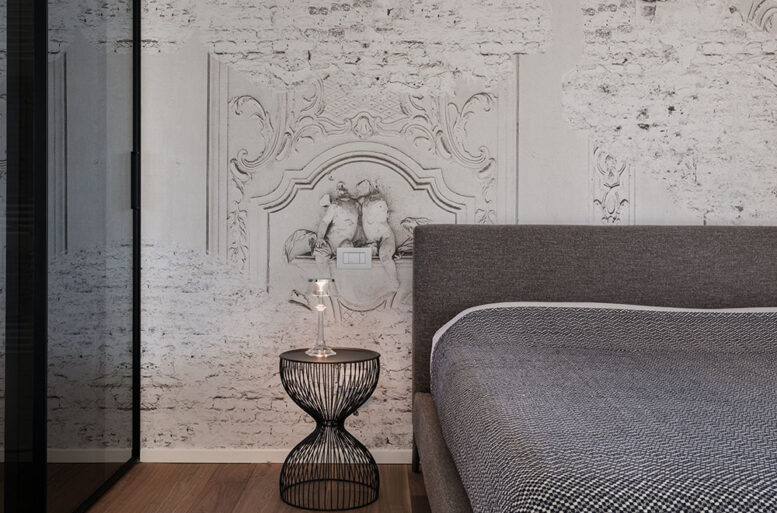 Nella camera padronale troviamo il letto matrimoniale Max di Twils, rivestito in tessuto grigio antracite, elegante e discreto, al quale fa da testata, una parete trattata con wallpaper Wall&Decò.