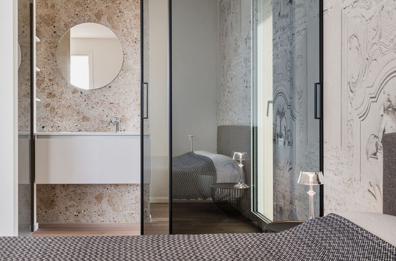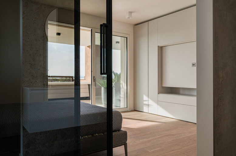 Ad accompagnare il visitatore alla zona notte, la porta scorrevole in vetro fumé di Rimadesio, inconfondibile nel suo stile, la soluzione garantisce la privacy, pur permettendo l’ingresso della luce negli ambienti. Stessa soluzione la ritroviamo nelle due grandi porte scorrevoli che dividono la camera matrimoniale dal bagno.