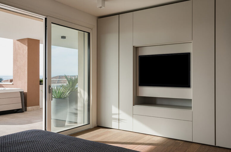 Questa parete della lunghezza di 5 ml ospita infatti la tv a schermo piatto e numerose ante e cassetti per il contenimento, così da garantire sempre l’ordine degli spazi.