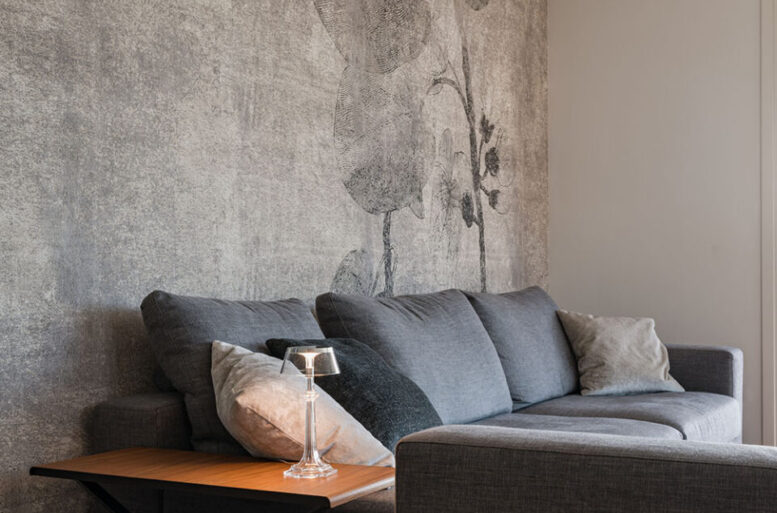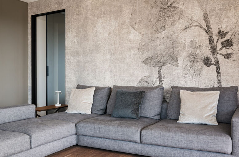 La particolarità di questo spazio è la parete di fondo che ospita il divano Ananta firmato Saba Italia, trattata con una particolarissima wallpaper di LondonArt, anch’essa in tonalità polverose e discrete, ma di grandissimo impatto scenico.