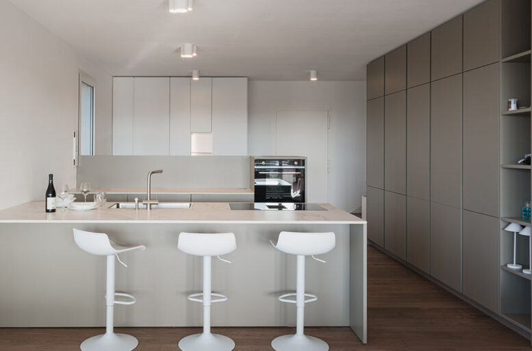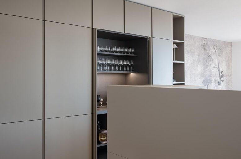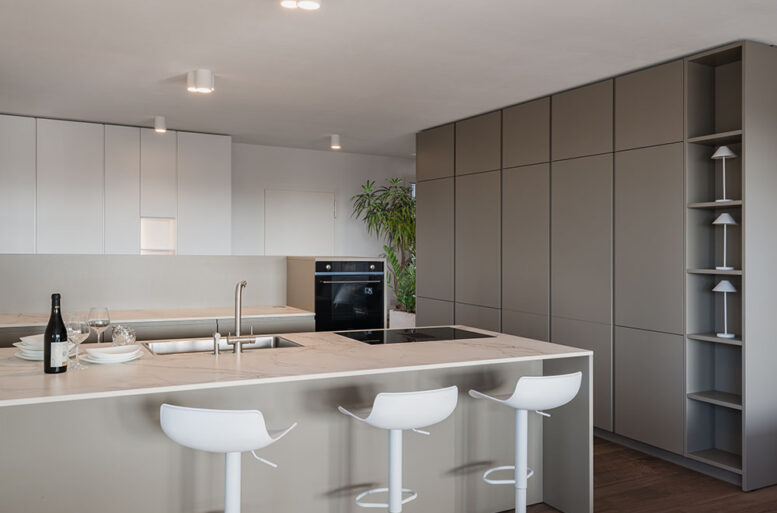 In linea con le scelte cromatiche dell’intera abitazione, sui toni polverosi, troviamo una meravigliosa colonna a tutta altezza in color corda che ospita le attrezzature tecniche, quali frigo, cantina, e colonna dispensa; di particolare rilevanza è la colonna con ante a scomparsa che ospita piccoli elettrodomestici di uso comune.