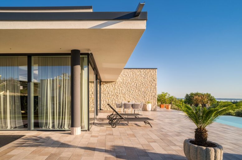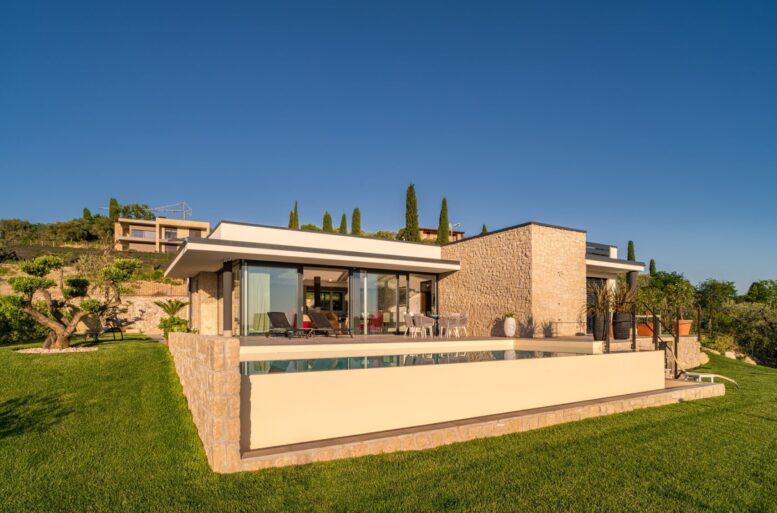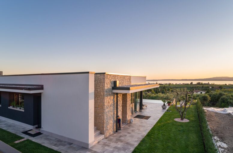 All’interno delle colline moreniche di Cavaion Veronese con vista mozzafiato sulla parte sud del bacino del Lago di Garda, sorge il residence Uliveto, sette ville immerse nell’uliveto che dialogano con la natura circostante e con il bellissimo Lago. La villa CS è stata la prima ad essere realizzata, disposta su un unico piano in modo tale da poter abbracciare con le grandi vetrate della zona giorno la piscina a sfioro infinity, che diventa una grande balconata che crea un tutt’uno con il lago all’orizzonte. L’edificio e stato progettato con forme semplici, un tetto piano verde, grandi vetrate e rifinito con particolari materiali naturali come la pietra che ricorda le murature di contenimento delle marogne degli uliveti circostanti.