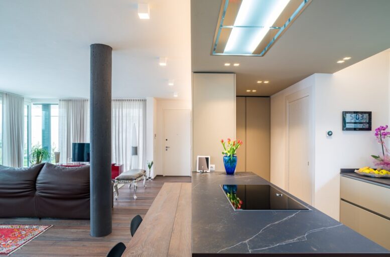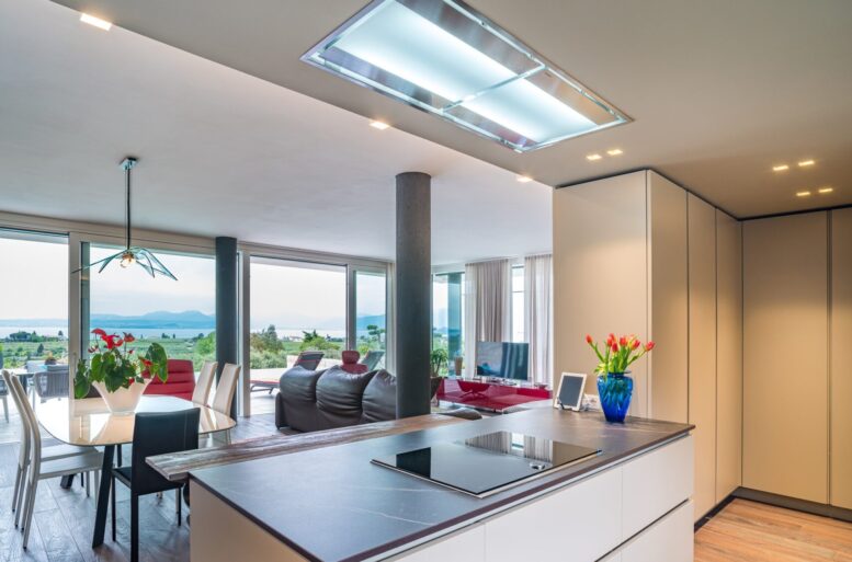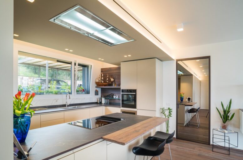 Il marchio dei professionisti d’arredamento di Ballarini Interni si può notare nella continuità tra i contenitori all’entrata e la cucina, che presentano gli stessi materiali. I contenitori sono stati concepiti come servizi “segreti”, che possono rivelare una cabina spogliatoio, un ripostiglio etc. Le colonne poi continuano fino a trasformarsi in una cucina aperta e luminosa. L’isola centrale con piano a induzione permette di cucinare ammirando lo splendido panorama, come anche la grande finestra di fronte al lavello. Infine, il piano in glass porcellanato scuro del piano dona un piacevole contrasto al tutto.