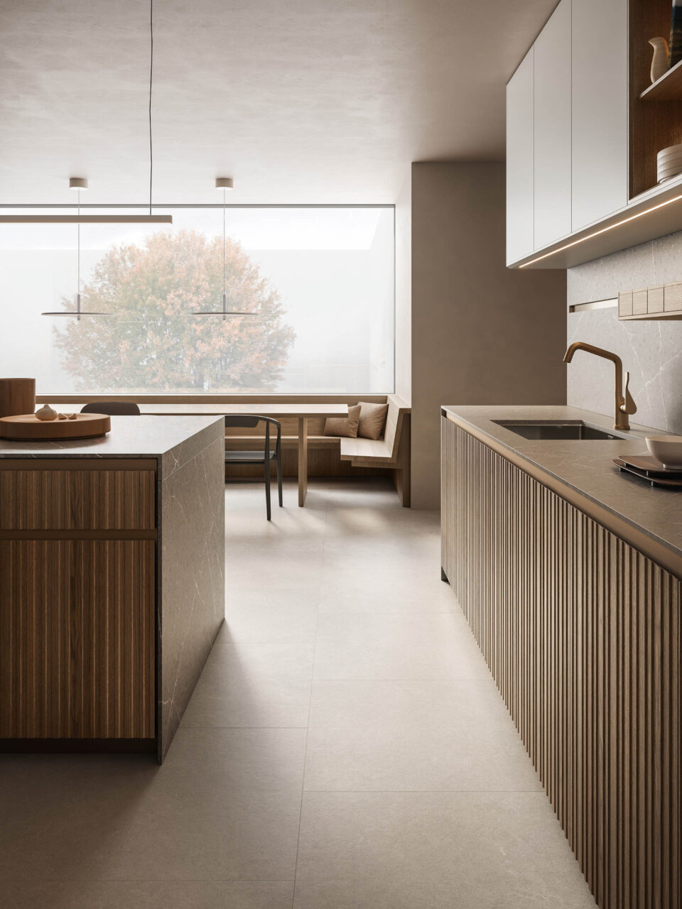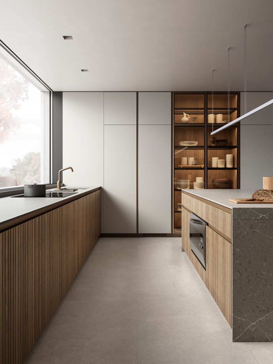 – ante a listelli in fossil oak NTF con profilo Gola in alluminio brushed bronze – piano in quarzo Mercury opaco by Quartzforms®